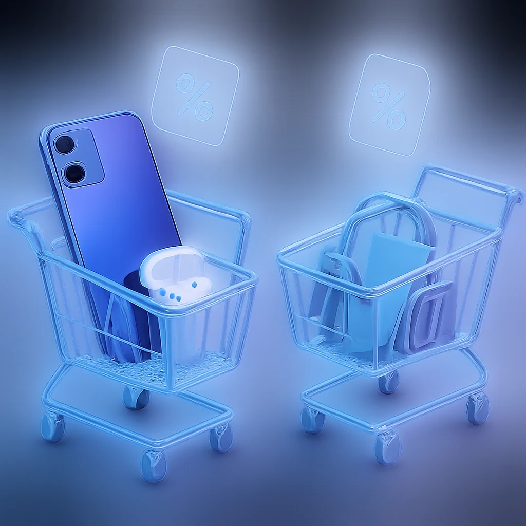 Ahora te vas a una tienda de tecnología en rebajas de enero. Quieres un móvil nuevo, y ya que estás, valoras añadir una funda y un cargador mejor.