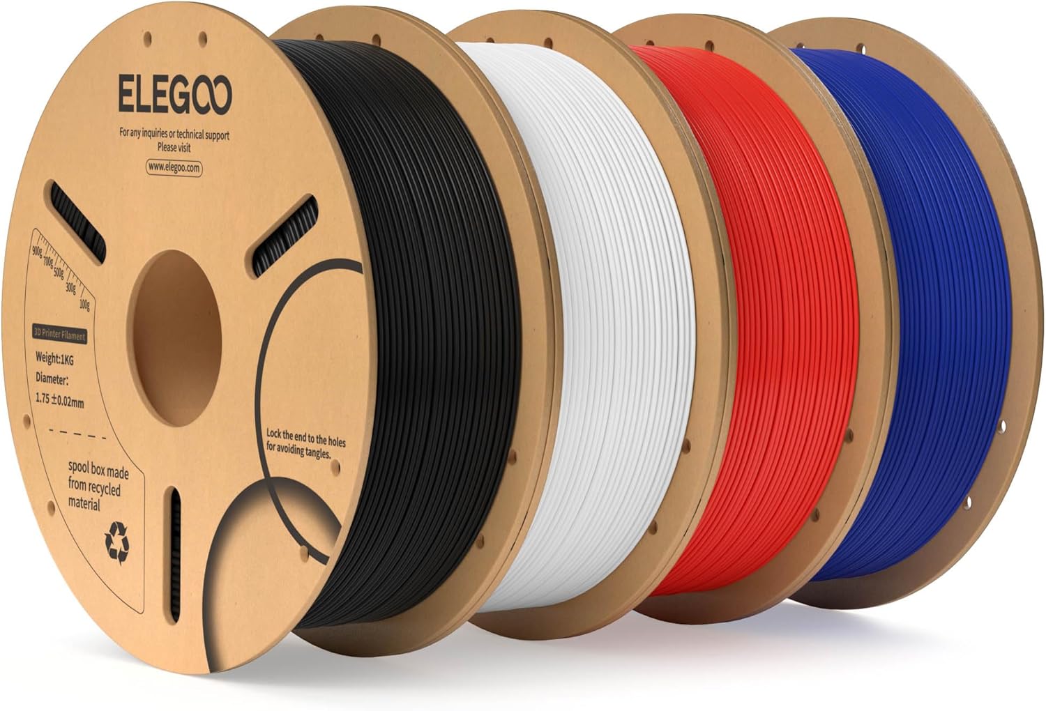 ELEGOO PLA Filament 1,75 mm in Schwarz/Weiß/Rot/Dunkelblau (4 kg) – mit Maßgenauigkeit von ± 0,02 mm