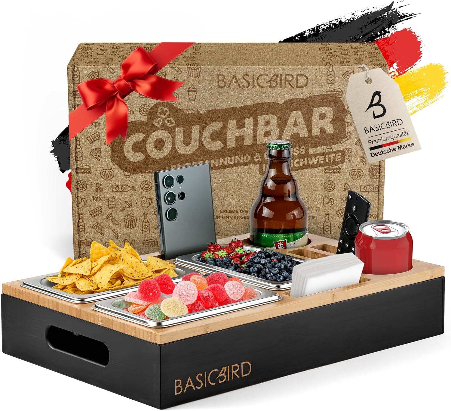 BASICBIRD® Couchbar Snackbox: Organizer-Tablett mit 3 Snackschalen, Getränkehalter und Fächern (Black Body)