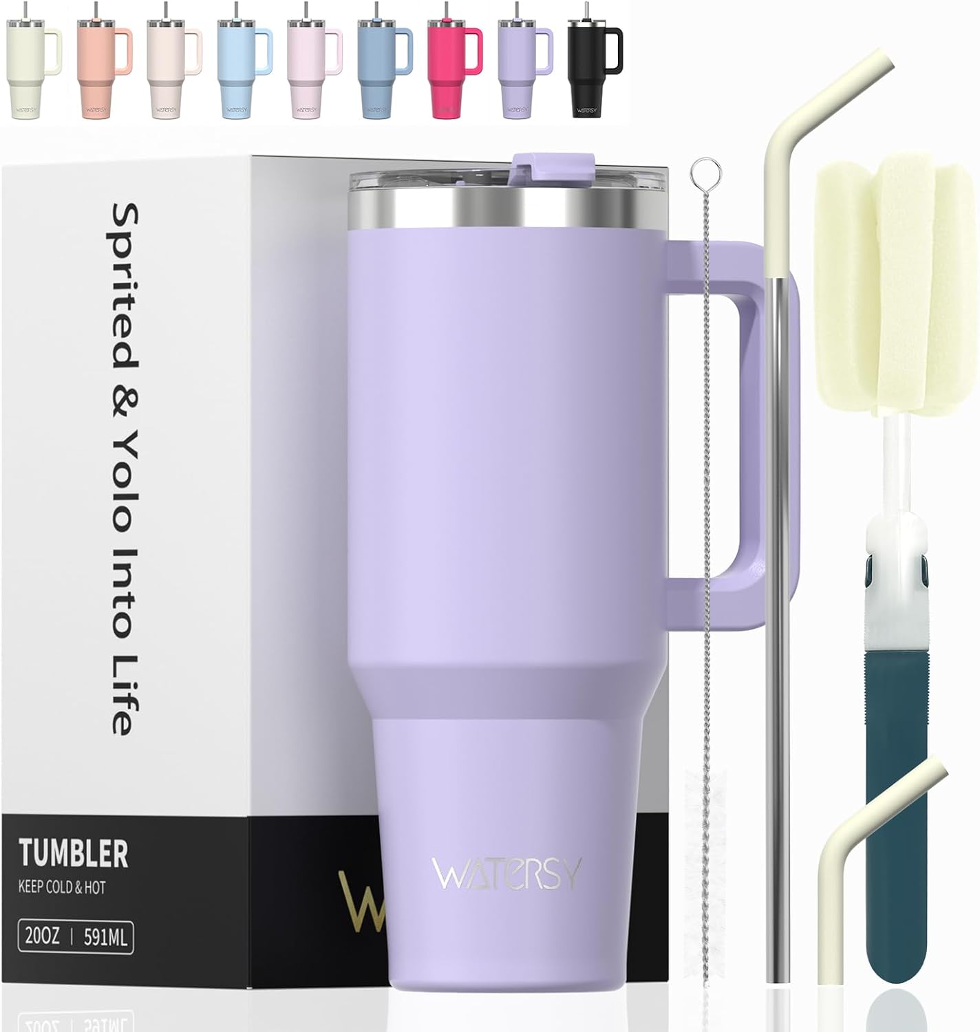 WATERSY 20oz Thermobecher to Go mit doppelwandigem Edelstahl, Griff & Strohhalm – lila