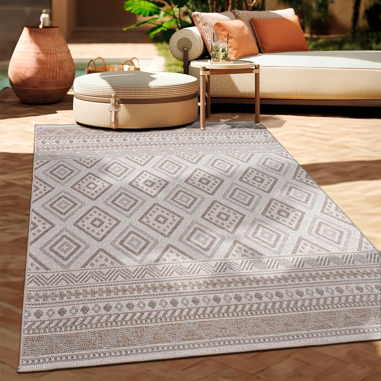 Paco Home Outdoor Teppich Flachgewebe Modern Boho-Style wetterfest & UV-beständig, 200x280 cm, Beige 2