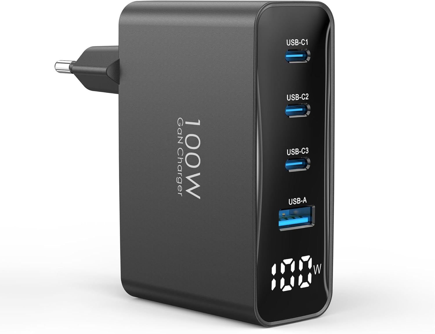 Auch die 4-Port-Logik spielt im Alltag eine Rolle: Die Beschreibung nennt, dass die USB-C1/C2/C3 Anschlüsse einzeln nutzbar sind und du „bis zu 100 W Ladeleistung“ bekommen kannst. Zusätzlich ist ein USB-A Anschluss dabei. Für typische Situationen heißt das: Ein Laptop, ein Smartphone und ggf. ein Tablet lassen sich an einem Netzteil bündeln, ohne jedes Mal nach dem nächsten Ladeziegel zu suchen.
