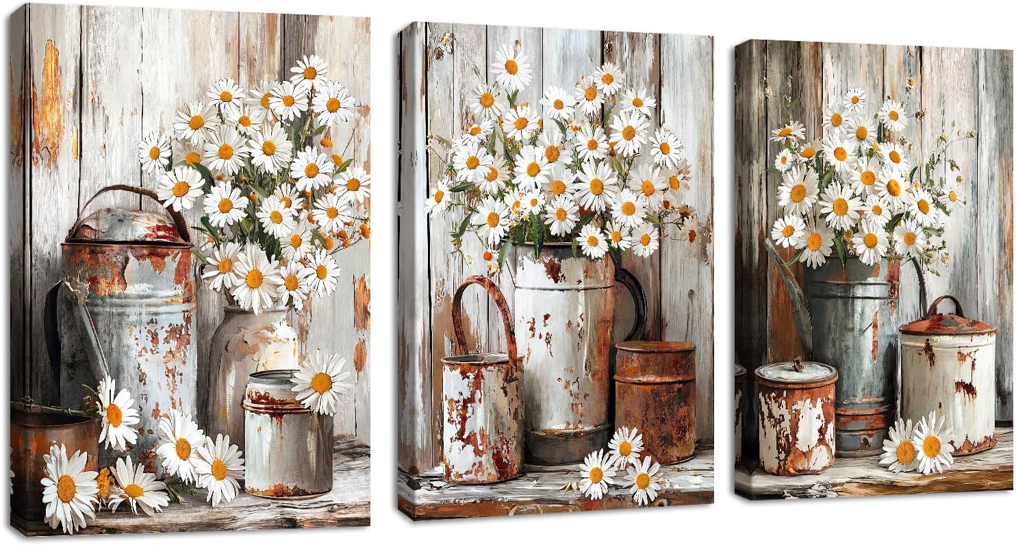 Das 3-teilige Leinwandbilder-Set mit rustikalen Gänseblümchen-Motiven ist als fertige Wanddekoration gedacht: Du bekommst pro Bild ein großes Leinwandplakat, das auf einem stabilen Massivholzrahmen montiert ist. Laut Hersteller ist das Set bereits „ready to hang“, inklusive Metall-Hängehaken am Rahmen, sodass du es ohne zusätzliche Bastelarbeiten an die Wand bringen kannst.