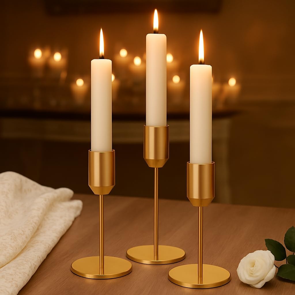 Das Alcohu 3er Set aus Metall ist ein Stabkerzenhalter-Set für eine klassische Tisch- und Kamin-Deko. Laut Hersteller besteht es aus massivem Eisen und gold eloxiertem Aluminium am Kerzenbecher. Das Ziel ist klar: ein stabiler Stand, der optisch „Vintage“ wirkt und sich für mehrere Anlässe eignet – vom Abendessen bis zur Hochzeitstafel.