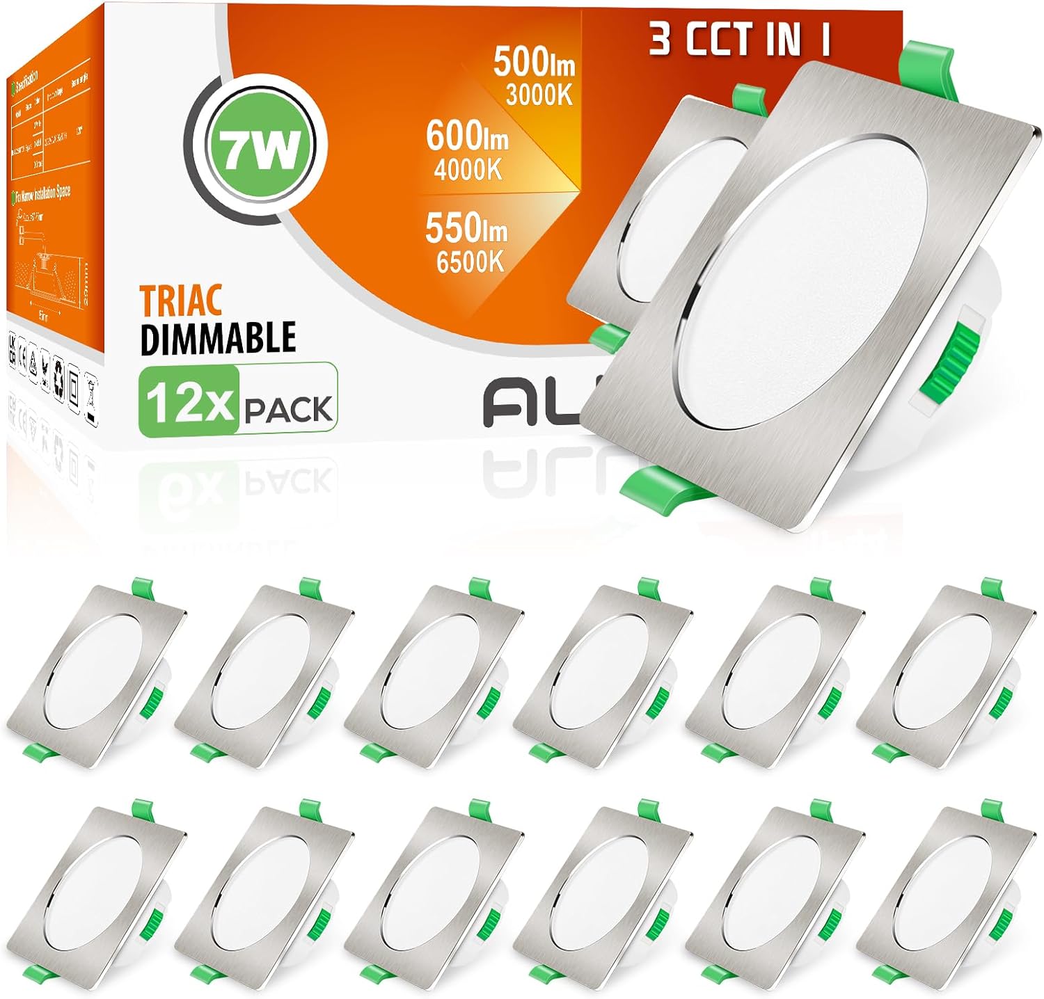 ALUSSO LED Einbaustrahler 230V eckig dimmbar, 7 W, IP44 (12er-Set) – 3 Farbtemperaturen wählbar, flach 68 mm, Nickel gebürstet