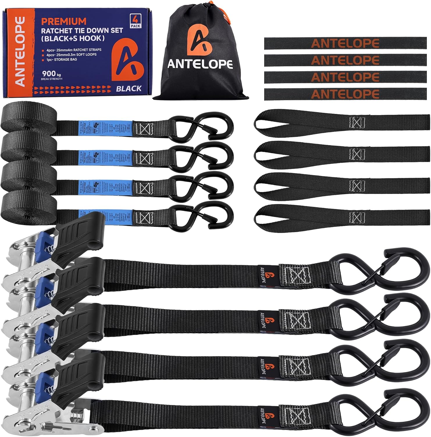A ANTELOPE Spanngurte mit Ratsche 25 mm x 4 m (4 Stück) – Zurrgurte für schwere Ladung, TÜV/GS, 900 kg Bruchfestigkeit