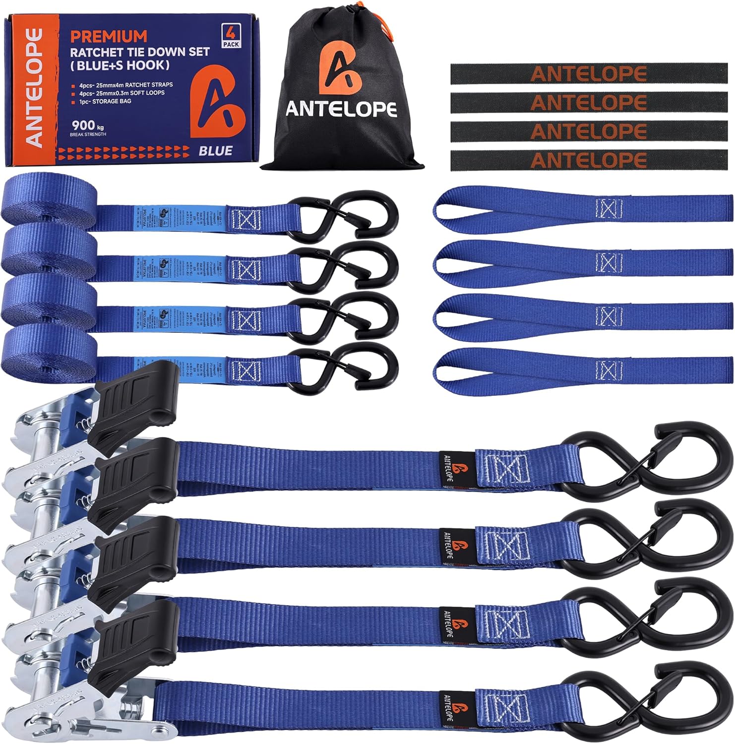 A ANTELOPE Spanngurte mit Ratsche 25 mm x 4 m (4 Stück) – Zurrgurte bis 900 kg Bruchfestigkeit, TÜV/GS