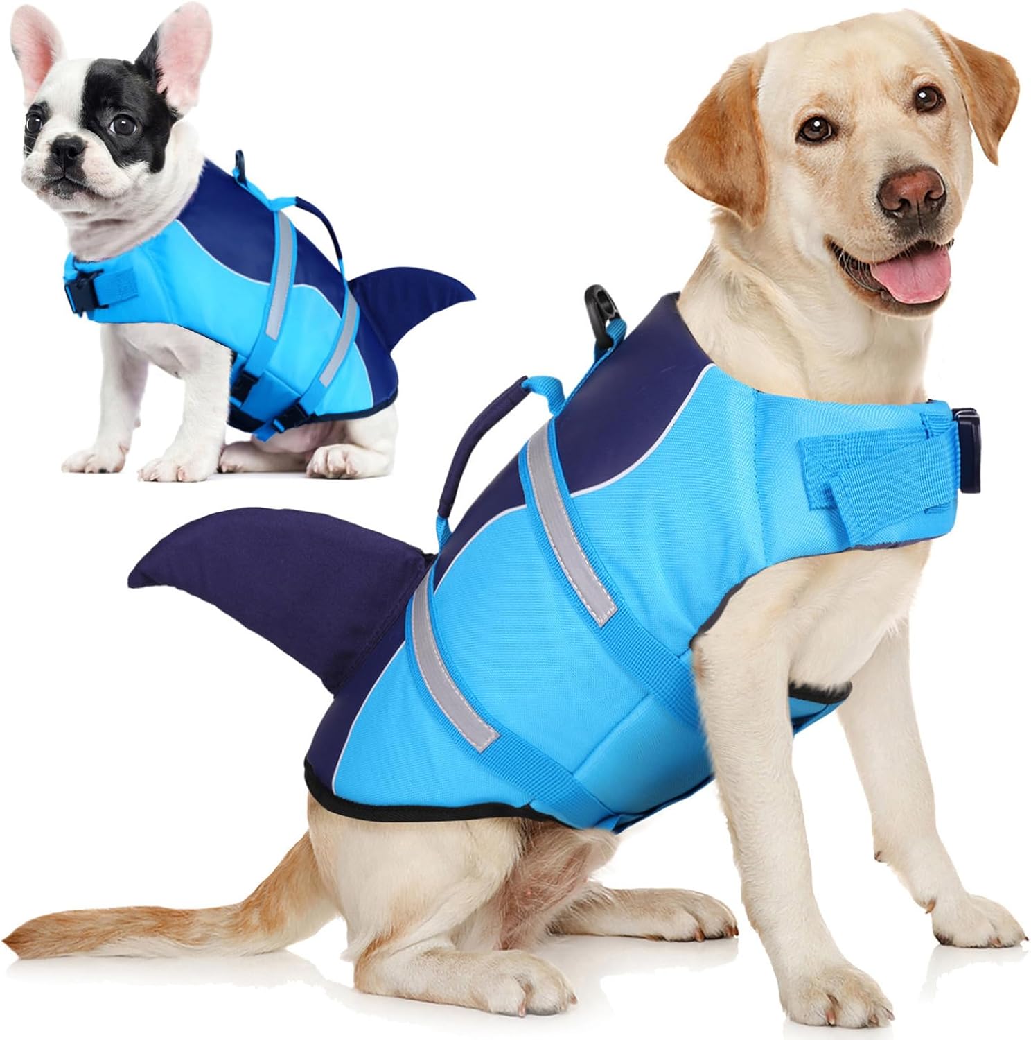 AOFITEE Schwimmweste Hund Mittel „Hai“ mit Tragegriff und reflektierenden Details: verstellbar für den Wassereinsatz. Preis und Größe vor dem Kauf prüfen.