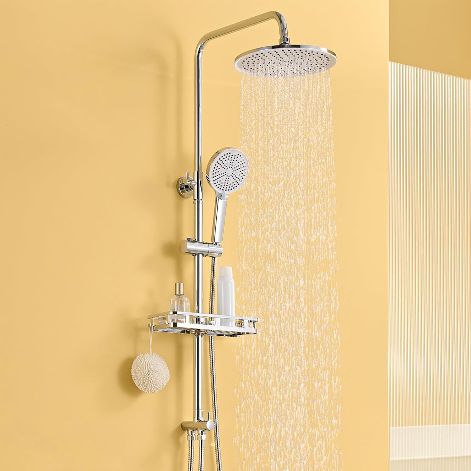 - Material: Duschsäule und Stange aus Edelstahl, Dusch-Umschalter (Wasserteiler) aus Messing, Duschkopf mit Silikon-Düsen, Duschregal aus ABS, Duschschlauch aus Edelstahl