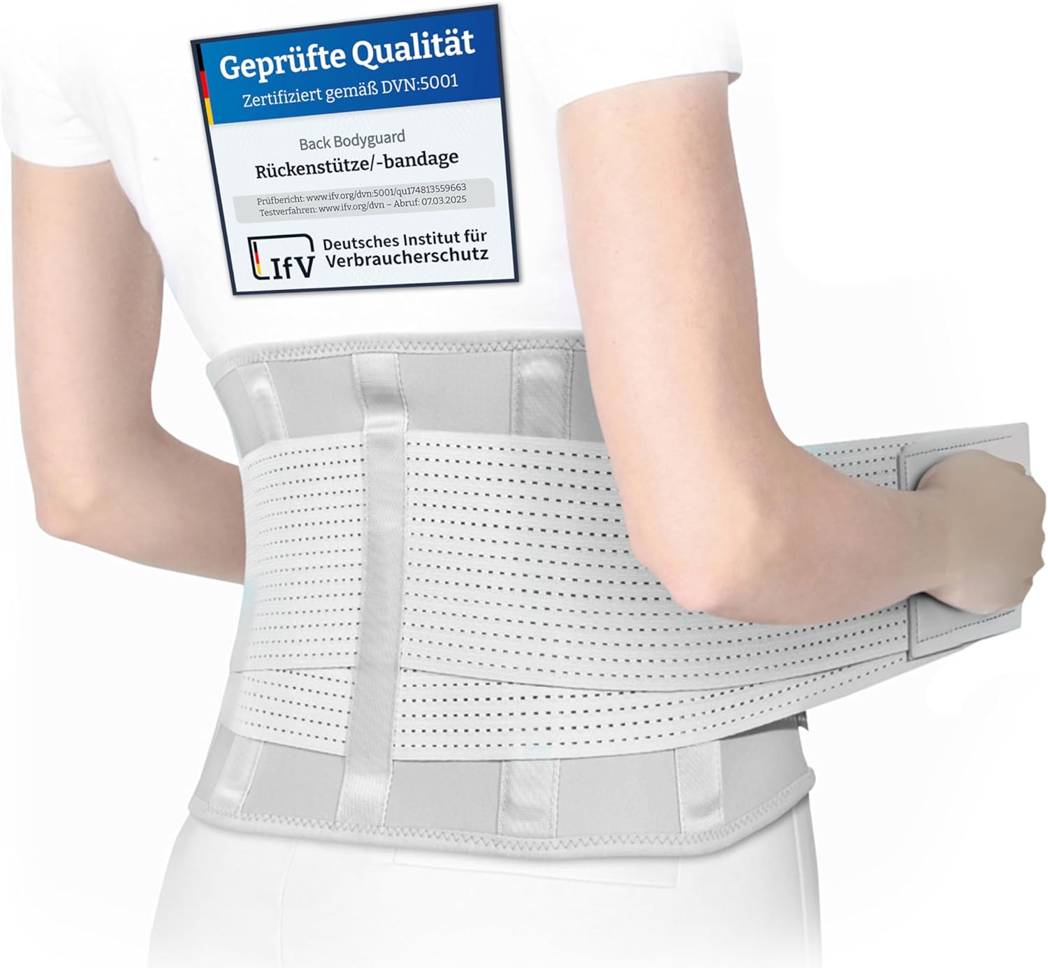 Der BACK BODYGUARD Rückenstützgürtel zielt darauf ab, Rücken und Taille im Alltag zu stabilisieren. Er soll eine aufrechte Haltung unterstützen und Schmerzen durch Ischias oder ISG-Beschwerden mildern. Das Modell verspricht eine diskrete Tragbarkeit – der Gürtel lässt sich laut Hersteller auch unter der Kleidung tragen.