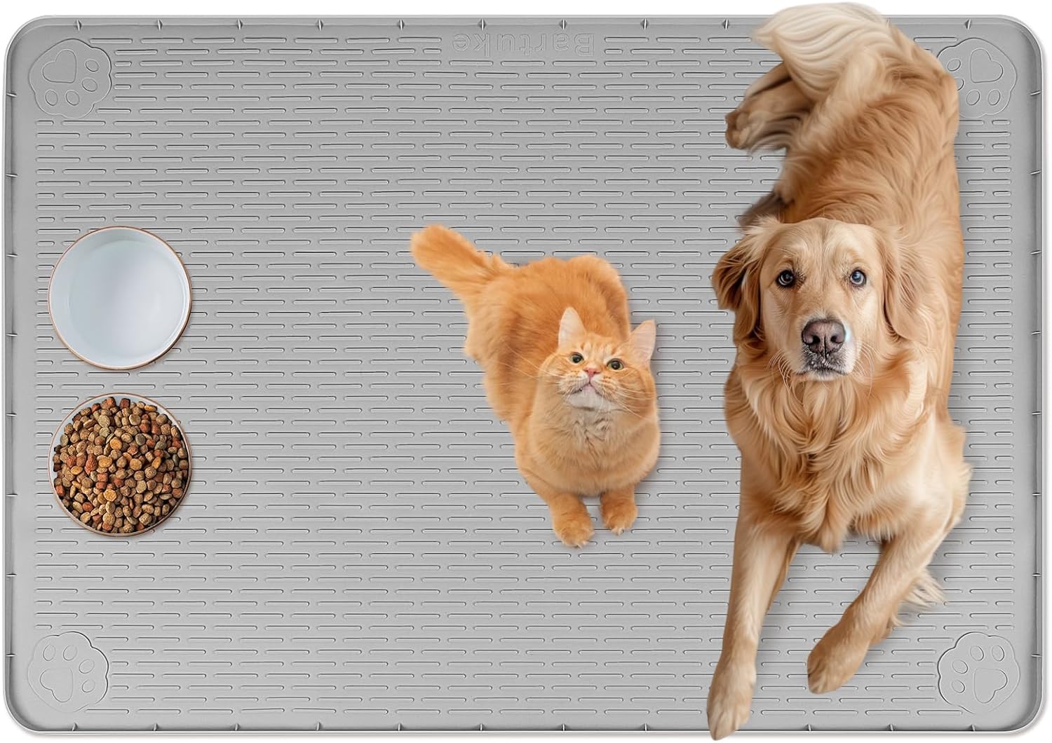 Wenn beim Fressen ständig Futter, Wasser oder „Mit-Schleppen“ auf dem Boden landet, ist eine Futtermatte schnell mehr als nur Deko. Die Bartuke Extra große Silikon Katzenfuttermatte (101 × 71 cm, Hellgrau) ist genau für diesen Alltag gebaut: Sie soll Pfoten und Boden sauber halten – und das auch dann, wenn mehrere Näpfe gleichzeitig im Einsatz sind. Über ihr Platzdeckchen für Futter- und Wassernäpfe wird das Ganze zusätzlich geordnet.