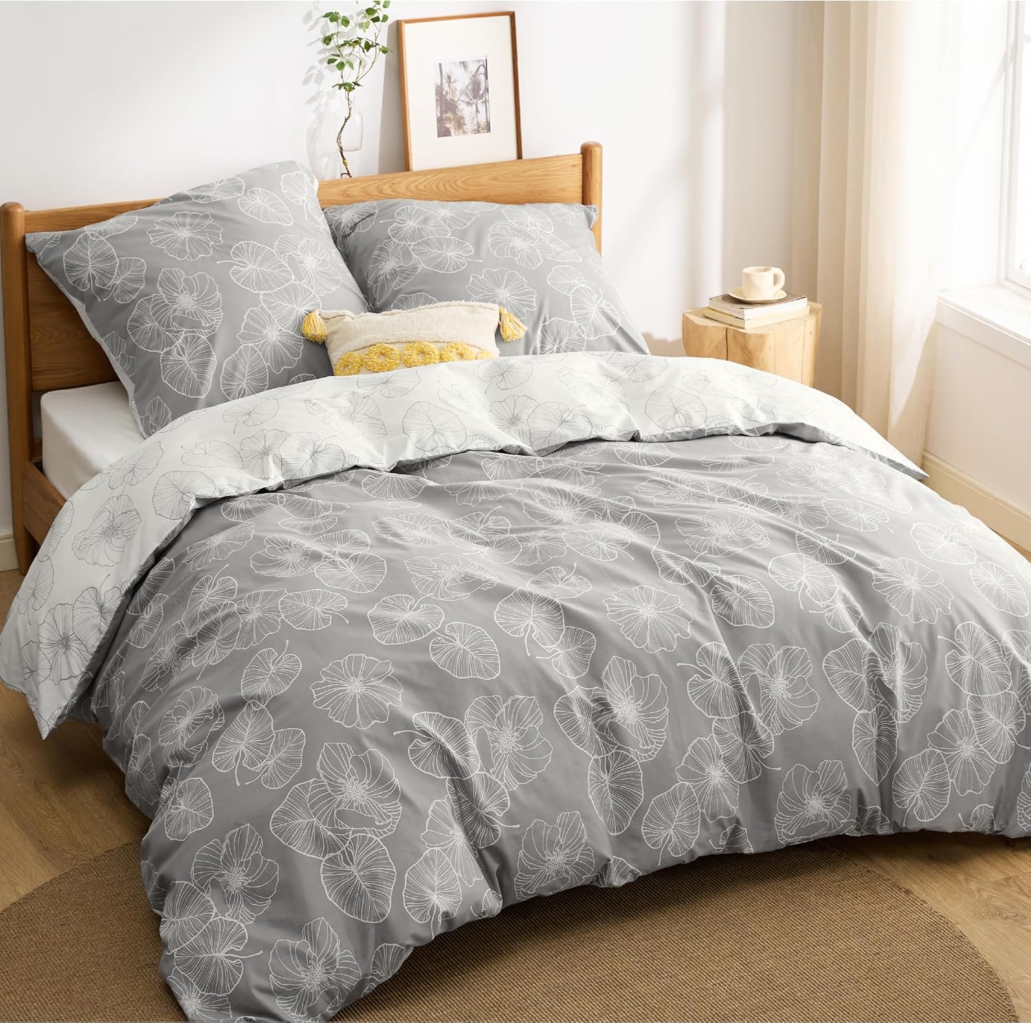 BEDSURE Bettwäsche 155x220 aus Baumwolle (3-teilig) mit Reißverschluss – Grau, Öko‑Tex, Ginkgo-Muster