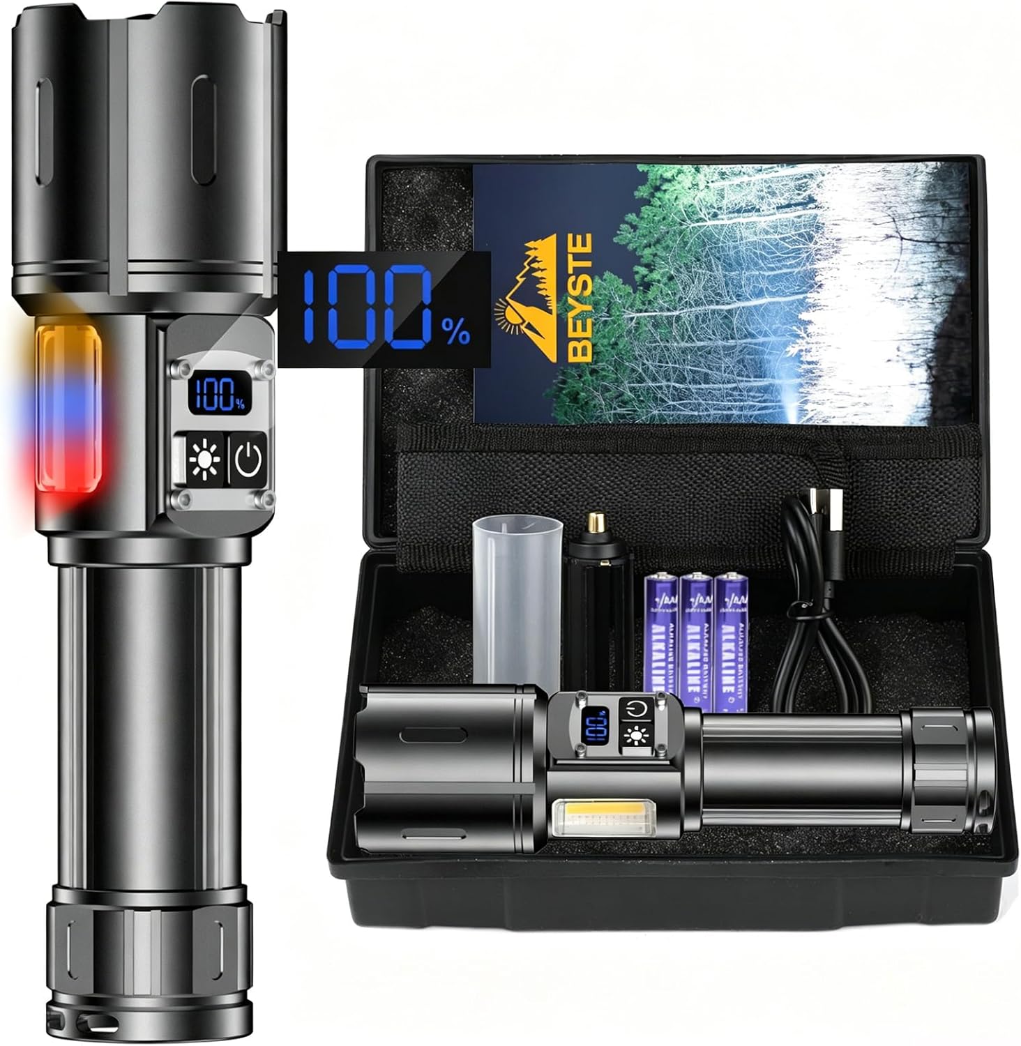 Die BEYSTE Taschenlampe LED Aufladbar liefert extreme Helligkeit und zuverlässige Leistung in rauen Outdoor‑Bedingungen. Mit zwei unabhängigen Steuerungen lassen sich Hauptlicht und COB Seitenlicht flexibel nutzen. Insgesamt stehen neun Modi zur Verfügung, darunter Stroboskop, SOS und eine stufenlose Dimmfunktion, sodass sich die Leuchtkraft exakt an die Situation anpasst. Die Kompaktbauweise, verbunden mit robustem Aluminiumgehäuse, macht sie zu einem zuverlässigen Begleiter beim Camping, Wandern oder Notfalleinsatz. Die integrierte LCD‑Anzeige zeigt den aktuellen Ladestatus, damit du die Batterie rechtzeitig wechseln oder nachladen kannst. Zusätzlich ermöglicht ein USB‑C Port das Aufladen über gängige Quellen und kann in Notsituationen sogar dein Smartphone unterstützen. Die Wasserdichtheit nach IPX6 schützt gegen Regen und Spritzwasser, während das versiegelte Gehäuse und Dichtungen die Zuverlässigkeit auch bei raue Wetterlagen erhöhen. Im Alltag überzeugt sie durch pragmatische Steuerung mit zwei Tasten, die Handhabung bleibt selbst mit dicken Handschuhen intuitiv. Ein längerer Einsatz in Not- oder Outdoor‑Situationen wird durch die kapazitätsorientierte Anzeige transparenter, sodass du besser planen kannst. Insgesamt kombiniert das Modell hohe Reichweite mit vielseitigen Funktionsoptionen und robuster Bauweise, ideal für Nutzer, die auf zuverlässige Lichtquellen angewiesen sind. 🌟 Die Lampe bietet damit eine echte Allround‑Lösung für Camping, Outdoor‑Abenteuer und schnelle Hilfe in Notfällen.