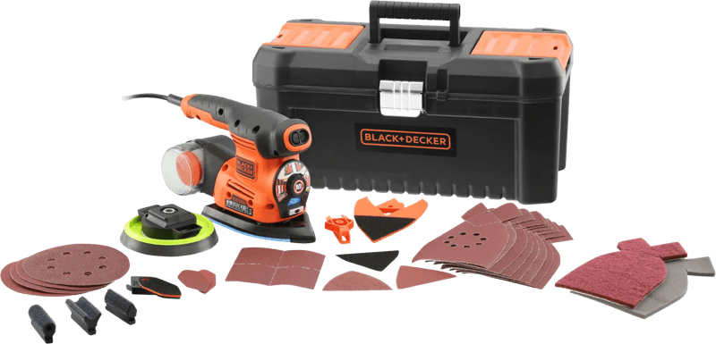 Der BLACK+DECKER KA280LKA‑QS ist ein vielseitiger Multischleifer, den du für zahlreiche Arbeiten nutzen kannst. Besonders praktisch ist das umfassende Zubehörset, das bei der Anschaffung enthalten ist und sich von detaillierten Schleifarbeiten bis hin zu mehreren Schleifpapierbögen reicht.