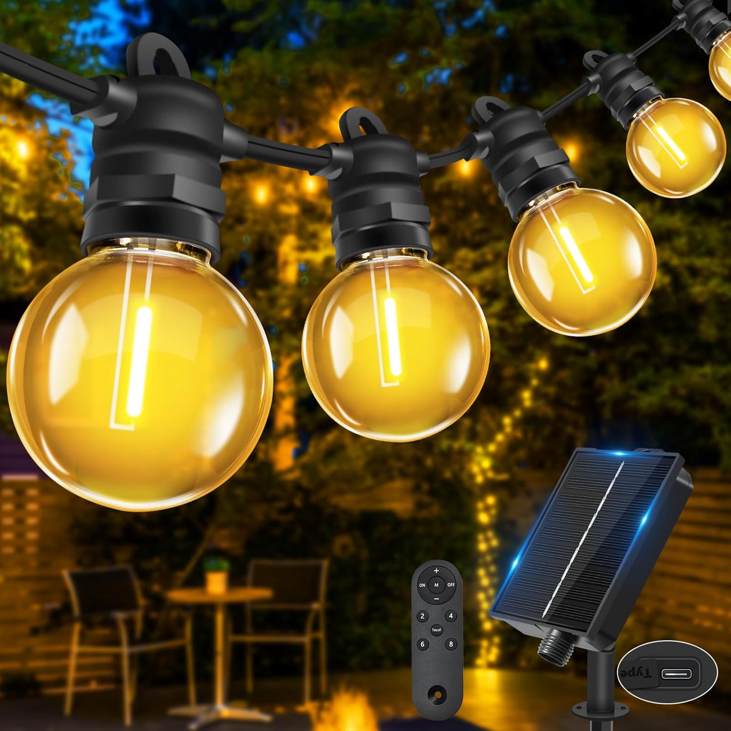 - Tacobey Solar-Lichterkette Außen bunt mit 20 G40-Lampen – 10 m 100 LED, USB-ladbar, 8 Modi (IP65)