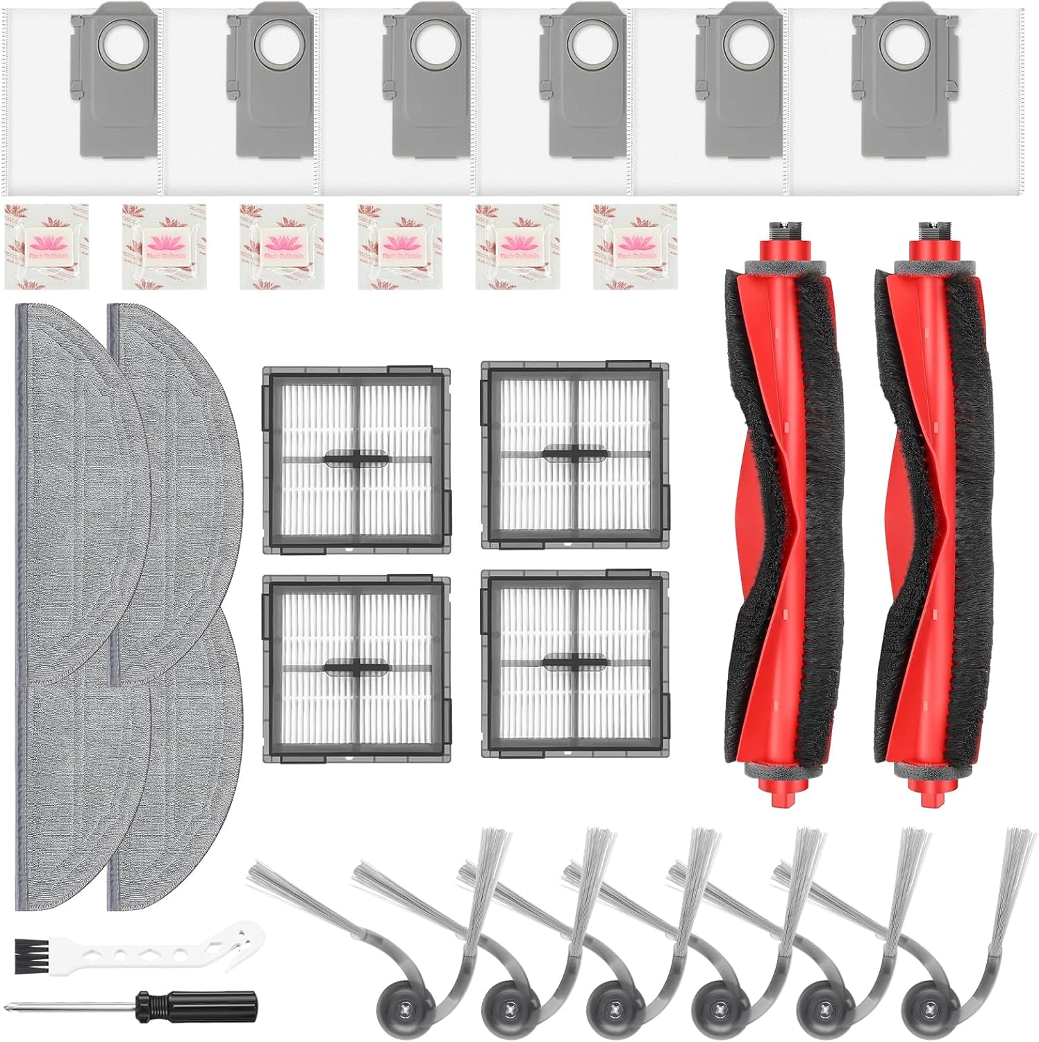 - Lieferumfang (30-teilig): 2 Hauptbürsten, 4 Filter, 4 Wischpads, 6 Seitenbürsten, 6 Flach-Duftsteine, 1 Reinigungsbürste & 1 Schraubendreher