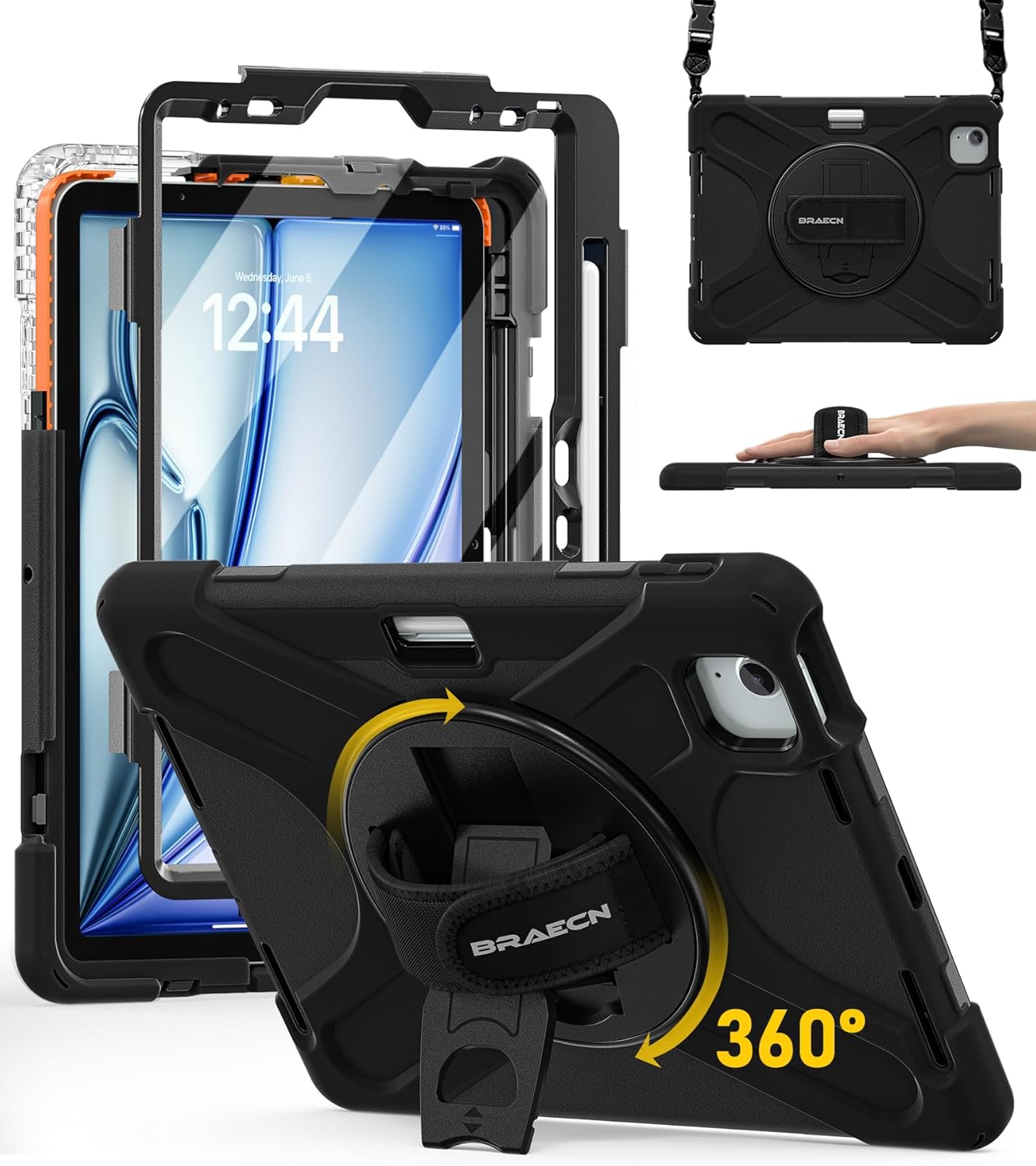 BRAECN Hülle für iPad Air 11 Zoll (M4/M3/M2, 2026/2025/2024) – stoßfeste Schutzhülle mit Displayschutz, 360° Ständer, Hand- und Schultergurt, Schwarz