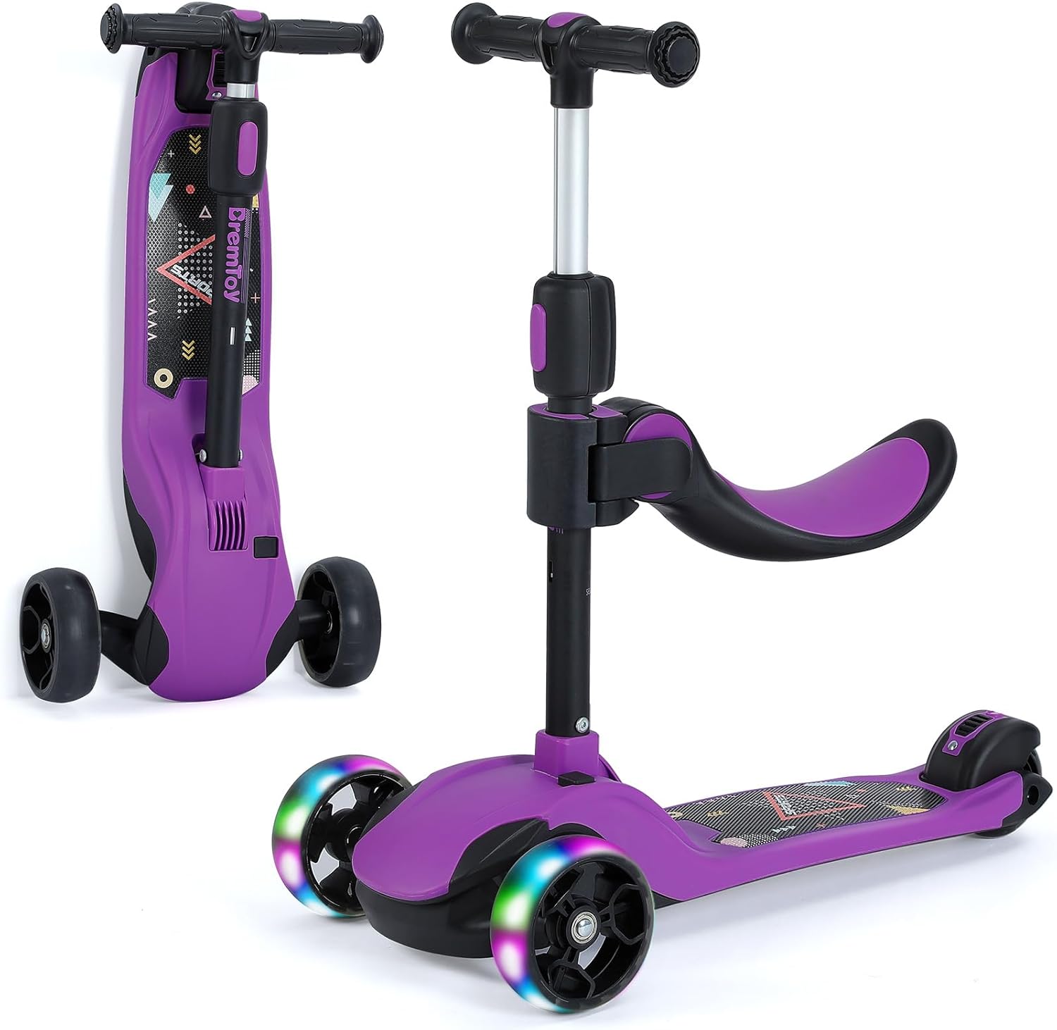 BremToy Roller Kinder mit abnehmbarem Sitz – stufenlos höhenverstellbarer Lenker, PU LED-Räder, faltbar
