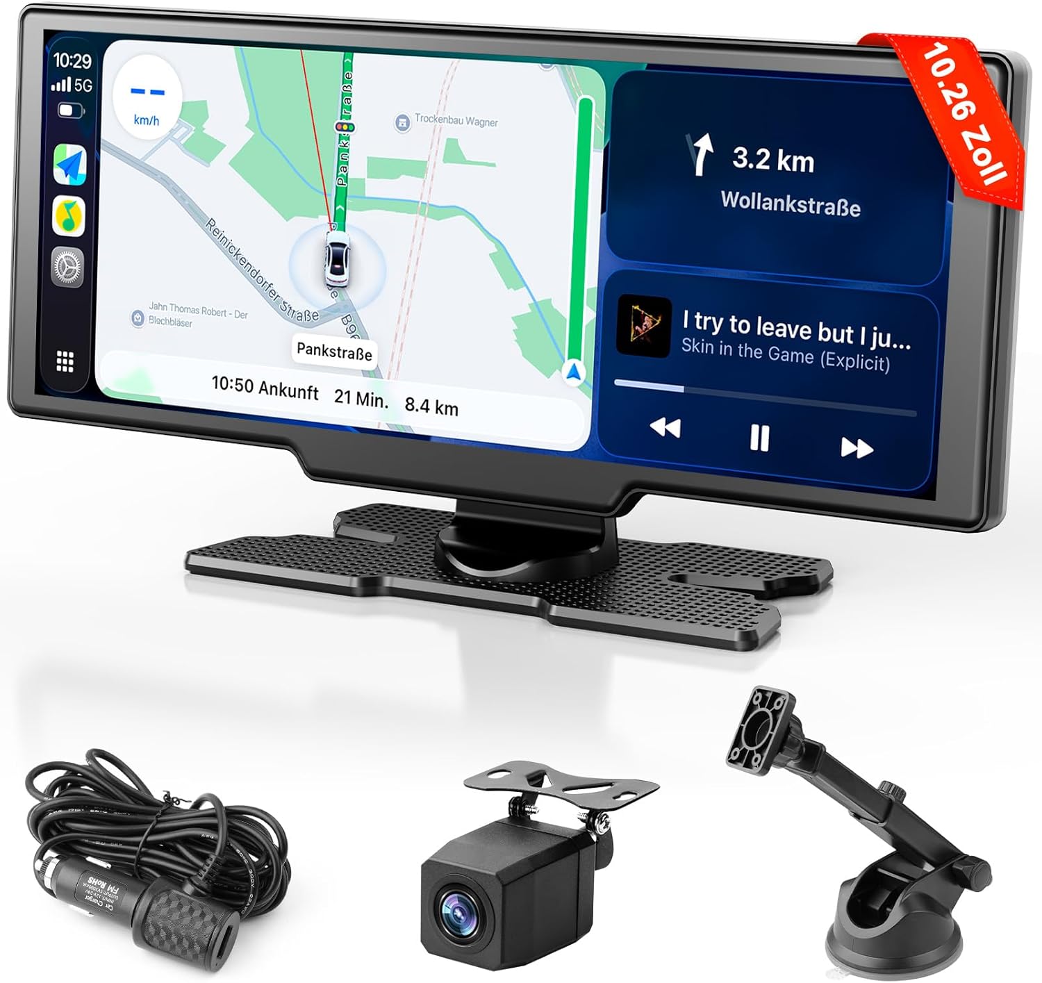 Dieses tragbare CarPlay-/Android-Auto-Display richtet sich an alle, die Navigation, Musik, Nachrichten und Telefonie im Auto nutzen möchten – ohne ständig neu zu koppeln. Auf dem Papier übernimmt das Gerät den drahtlosen Verbindungsweg per Bluetooth und zeigt die relevanten Inhalte auf einem 10,26‑Zoll IPS-Touchscreen an. Zusätzlich ist eine Rückfahrkamera integriert, die beim Einlegen des Rückwärtsgangs automatisch aktiviert wird.