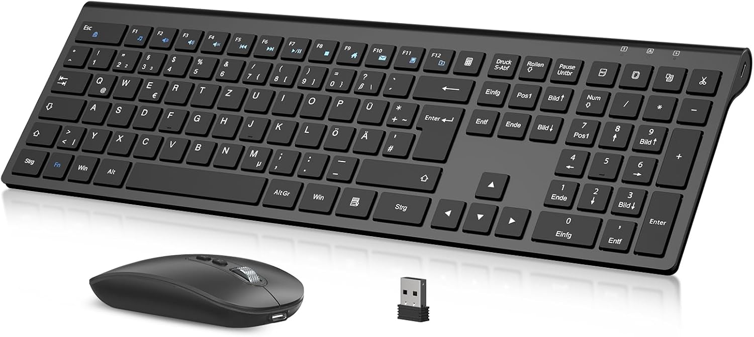 cimetech Tastatur-Maus-Set kabellos (ultradünn, wiederaufladbar) mit QWERTZ-Layout für Windows & mehr – Schwarz