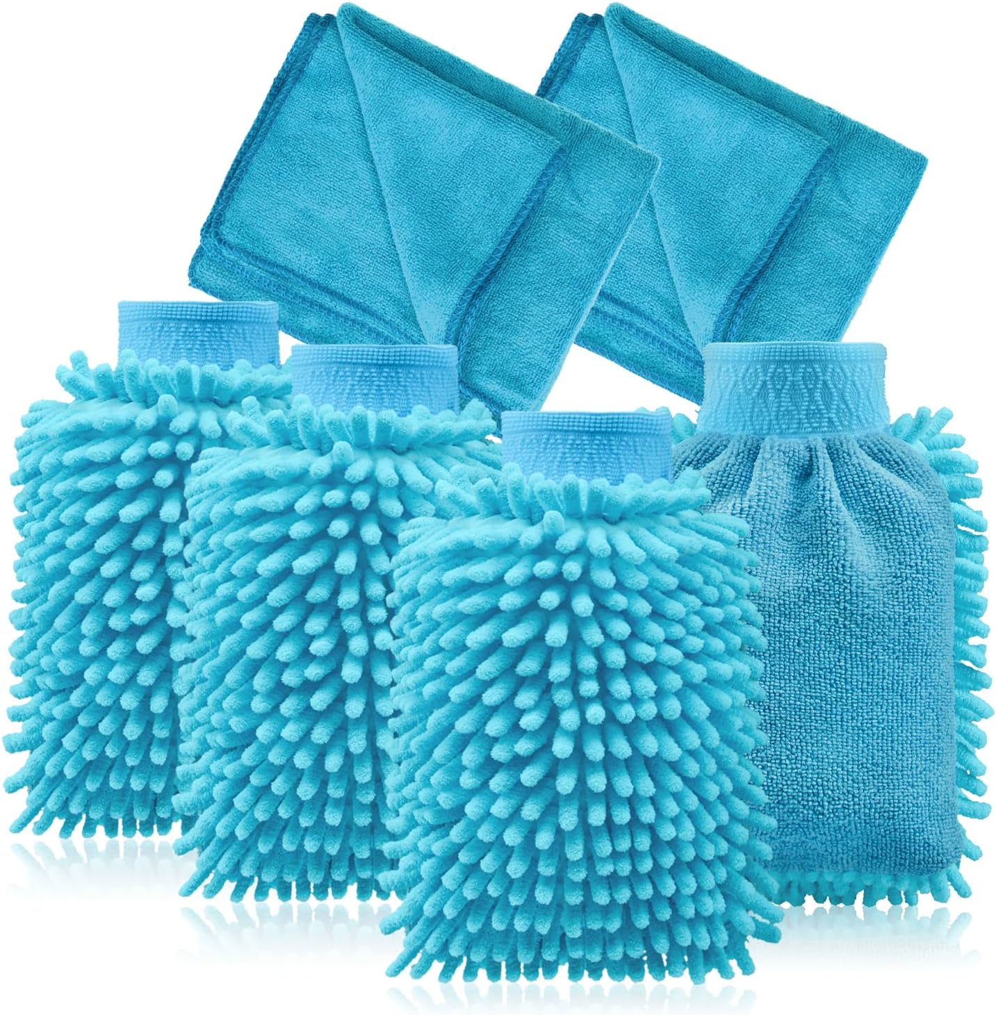 Es sind insgesamt 6 Teile enthalten: 4x Autowaschhandschuh und 2x Mikrofaser-Tuch.