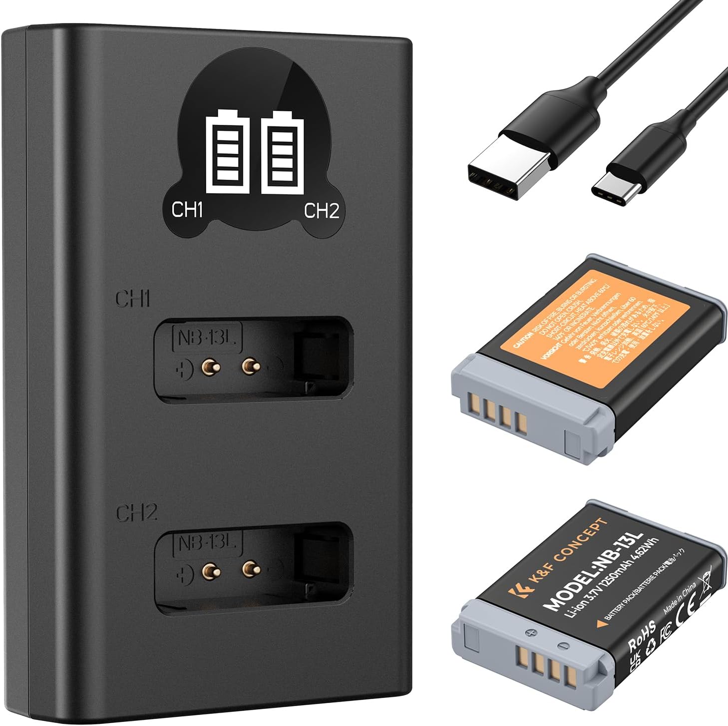 K&F CONCEPT Canon NB-13L Ersatzakku (2 Stück) + Dual-Slot LCD-Ladegerät für viele Canon-Kameras