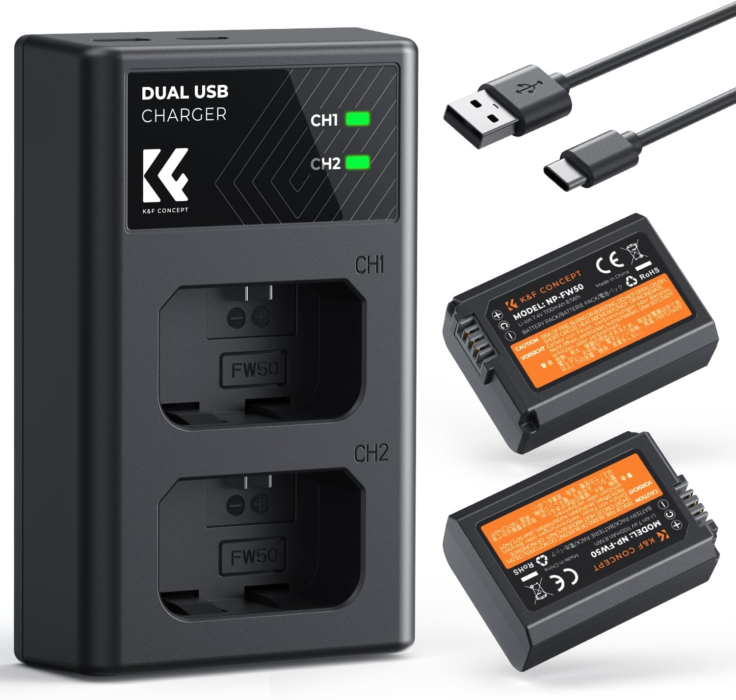 K&F CONCEPT NP-FW50 Kameraakku Ladegerät – 2er-Set 1100 mAh inkl. Dual-Ladeoption (Typ-C/USB-A) für Sony