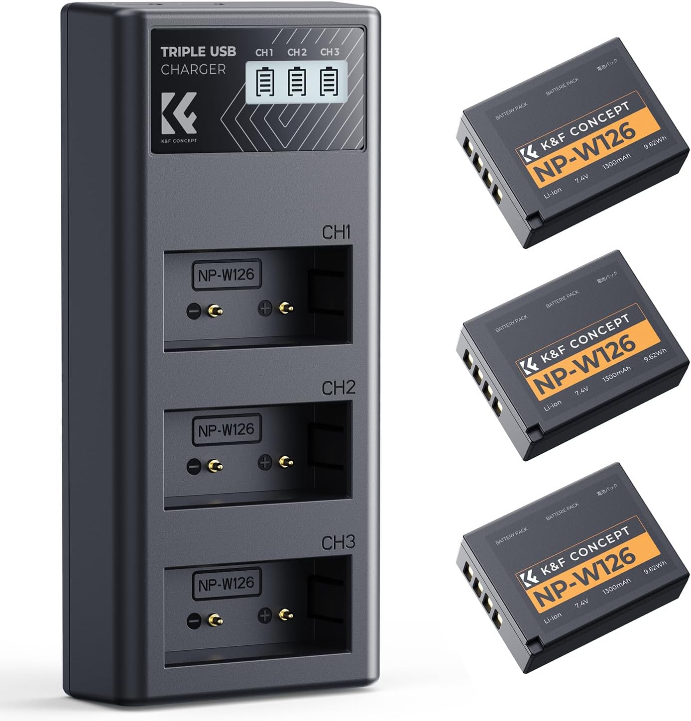 K&F CONCEPT NP-W126 / NP-W126S 3er-Pack Akkus inkl. 3-Fach-Ladegerät (kompatibel mit Fujifilm X-Serie)