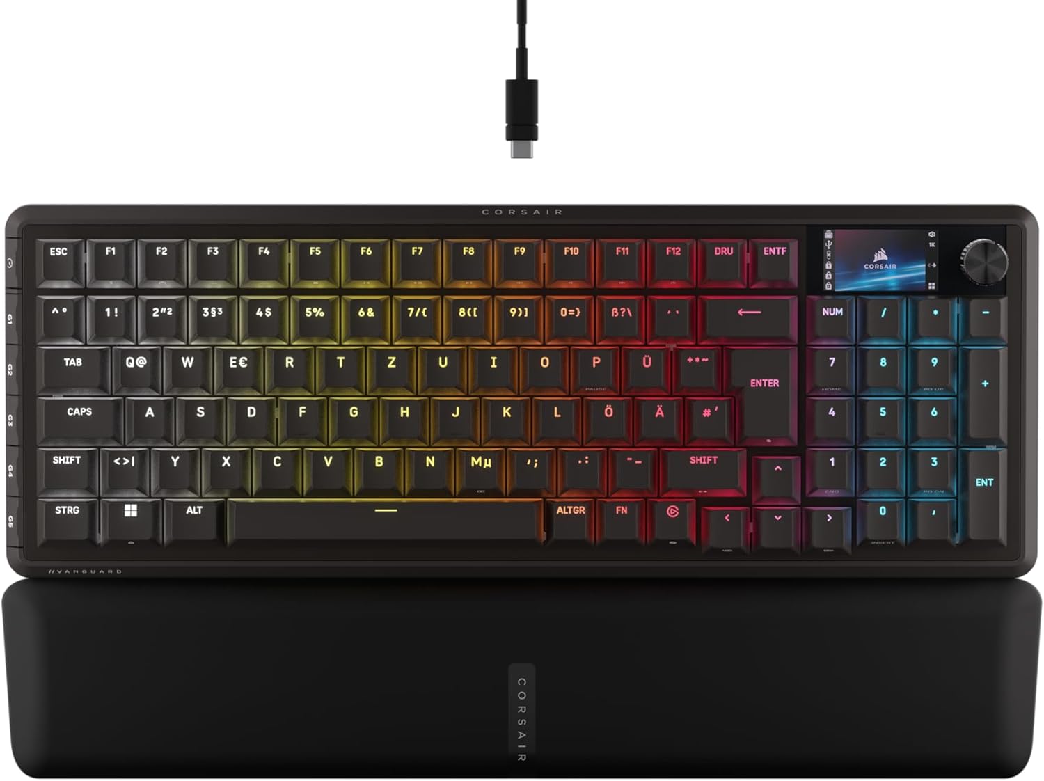 Die Corsair Vanguard 96 ist eine kabelgebundene mechanische Gaming-Tastatur mit einem kompakteren 96 %-Layout, das alle wichtigen Tasten wie Pfeiltasten und eine Zehnertastatur in einem Gehäuse bietet das fast so klein wie eine TKL-Tastatur ist. Das integrierte 1,9 Zoll LCD-Display sorgt für eine individuelle Tastaturpersonalisierung, zeigt Animationsbilder Systemdaten und weitere Inhalte in Vollfarbe an und eröffnet so neue Wege der Benutzererfahrung. Mit der extrem schnellen Reaktionszeit von 8000 Hz Hyperpolling minimiert sie Eingabeverzögerungen und sorgt bei schnellen Spielen und Streaming-Befehlen fürlebhafte Reaktionszeiten. Die G-Tasten lassen sich dank Elgato Virtual Stream Deck-Integration direkt den jeweiligen Funktionen zuordnen und ermöglichen so einen nahtlosen Zugriff auf häufig genutzte Aktionen. Die FlashTap SOCD-Funktion bietet flexible Optionen zur Handhabung versehentlicher SOCD-Eingaben, sodass Bewegungen besser dem ursprünglichen Bewegungsziel folgen. Die wackelfreien CORSAIR MLX-Schalter garantieren eine präzise Tastenführung, stabile RGB-Beleuchtung und eine hohe Lebensdauer von bis zu 80 Millionen Tastendrücken. 💡 Zusätzlich unterstützt die Vanguard 96 eine einfache Tastenschalter-Hot-Swap-Funktion für 3- und 5-polige Schalter, was individuelle Anpassungen ermöglicht. 🔧 Die Tastatur kommt in elegantem Schwarz und bietet dank der starken Hintergrundbeleuchtung, dem großen Darstellungsdisplay und dem vielseitigen Funktionsumfang eine robuste Grundlage für anspruchsvolle Gamer und Content Creator. 🚀