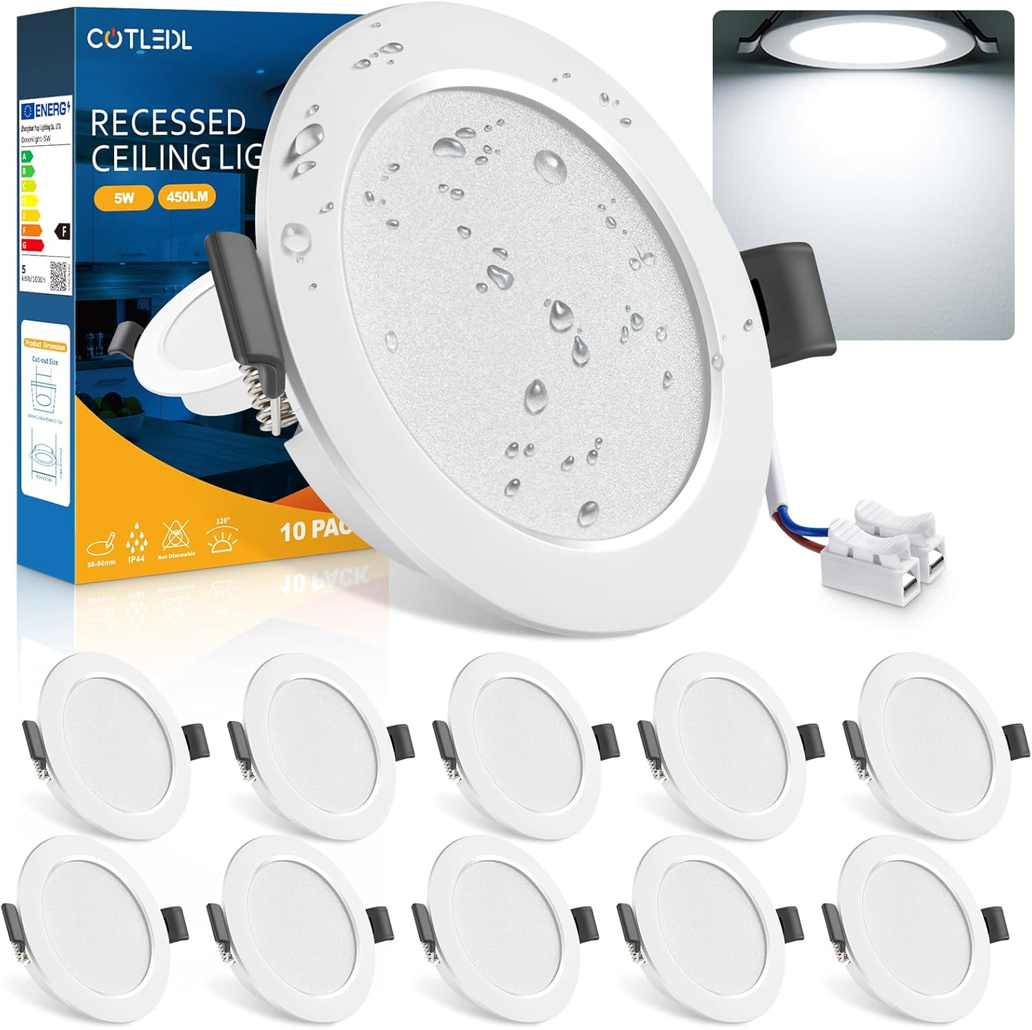 Auf dem Papier ist das Set für die flächige Ausleuchtung von Decken gedacht: 10 Spots mit jeweils 5W Leistungsaufnahme und 450 Lumen pro Strahler. Dazu kommt eine Schutzart IP44, die laut Beschreibung gegen Staub sowie gegen Spritzwasser bzw. Wasserdampf ausgelegt ist. Ob das am Ende zu deinem Badezimmer passt, hängt aber stark davon ab, wie die Einbauöffnung, der verfügbare Deckraum und der Einsatzort genau beschaffen sind.