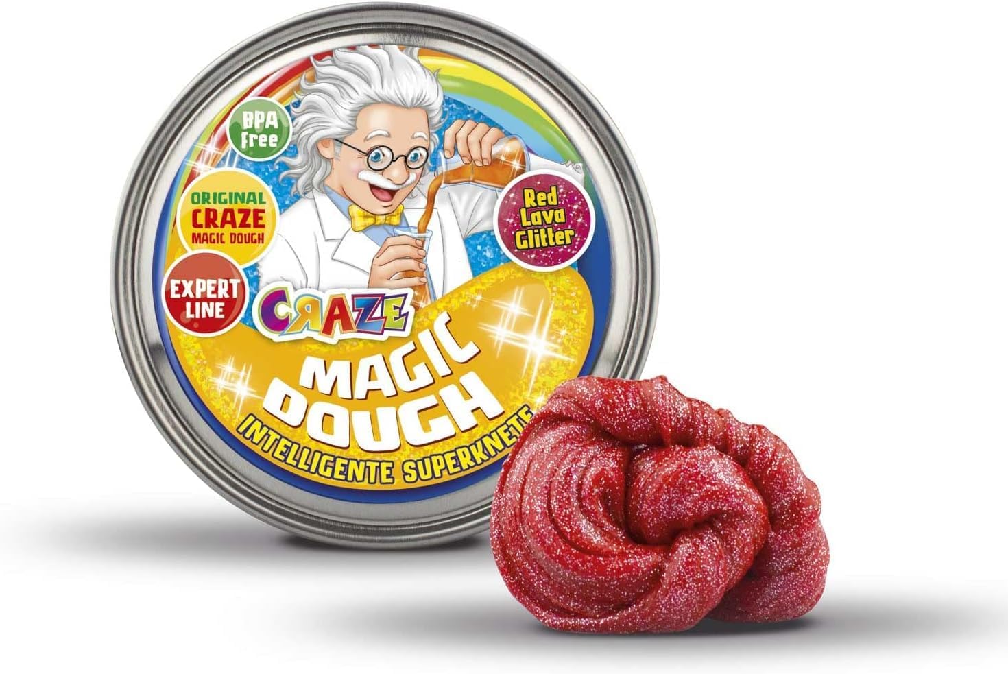 Craze MAGIC DOUGH Experte Professor ist eine wieder knetbare Modelliermasse speziell für Kinder. Sie bleibt flexibel, lässt sich leicht formen und rebound wie eine Gummi-Kugel. Die Masse trocknet nicht aus und kann außerdem geschnitten werden. Mit rund 70 g Inhalt in einer passenden Farbbox eignet sie sich gut für kreativen Spielspaß unterwegs oder zu Hause.