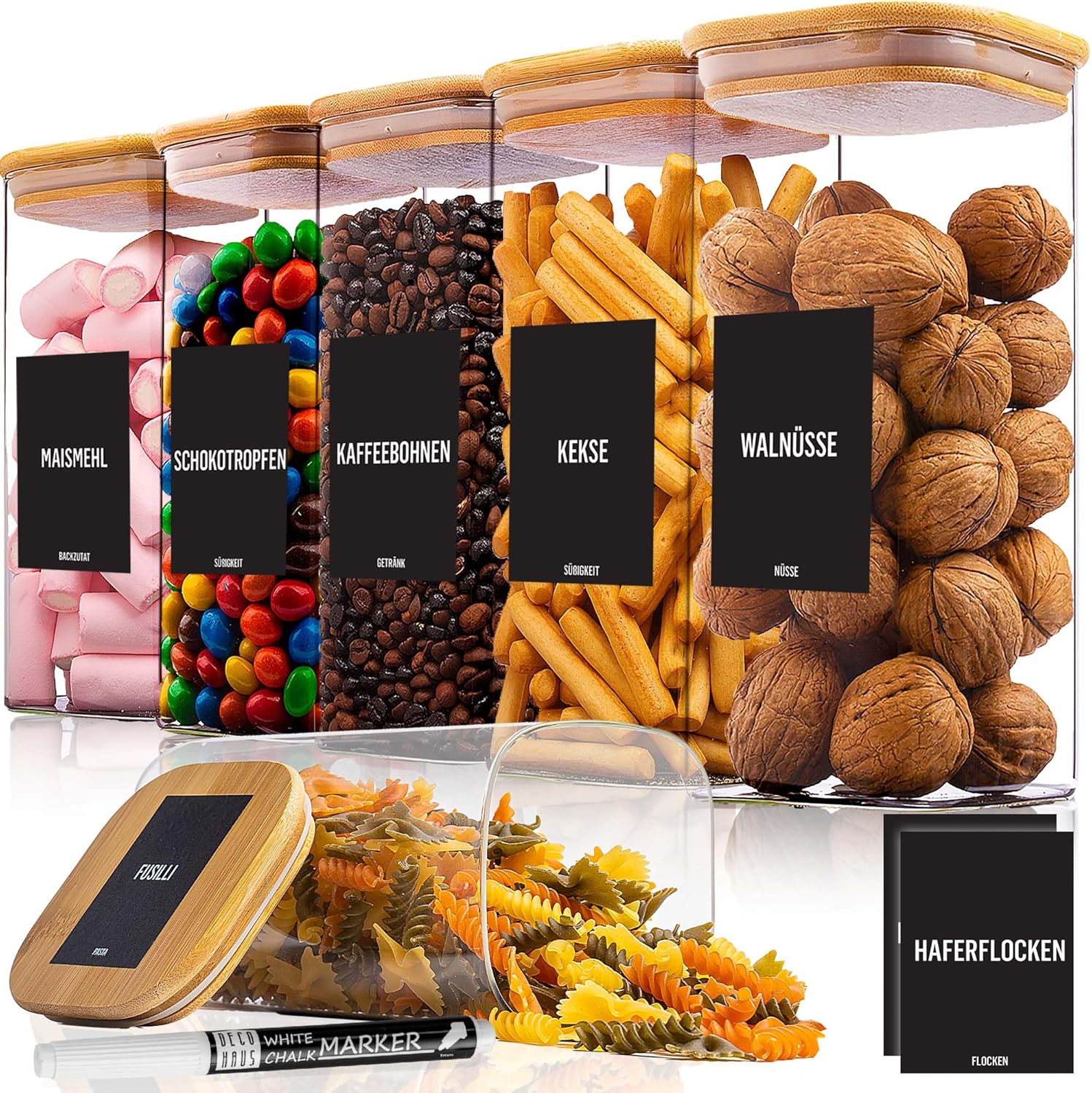 Wenn du gern sichtbar aufbewahrst, ist dieses Vorratsglas-Set eine sinnvolle Ergänzung für deine Küchenroutine. Die Kombination aus Glasbehältern und Bambus-Deckeln passt optisch zu vielen Einrichtungsstilen, ohne dass du dafür zusätzliche Aufkleber oder komplizierte Systeme brauchst. Für die Beschriftung erhältst du außerdem vorgedruckte deutsche Etiketten sowie Blanko-Varianten und einen Kreidestift. Damit weißt du auch nach Tagen oder Wochen auf einen Blick, was sich im Glas befindet. 🙂