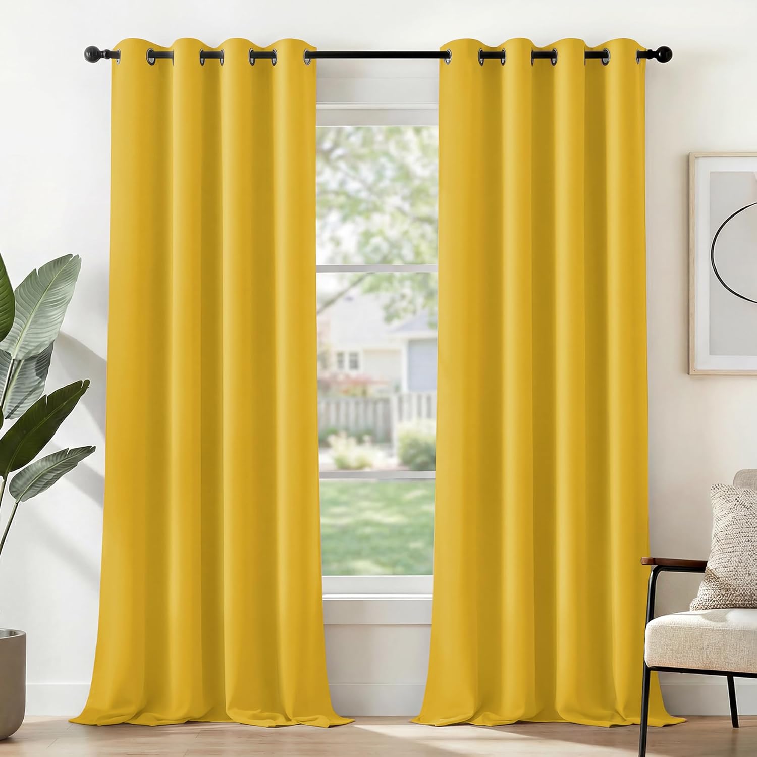 Mit dem 2er-Set bekommst du gleich zwei Vorhänge, die du unkompliziert direkt an eine Gardinenstange hängen kannst. Das Material ist laut Hersteller 100 % Polyester, die Farbe ist Senfgelb.