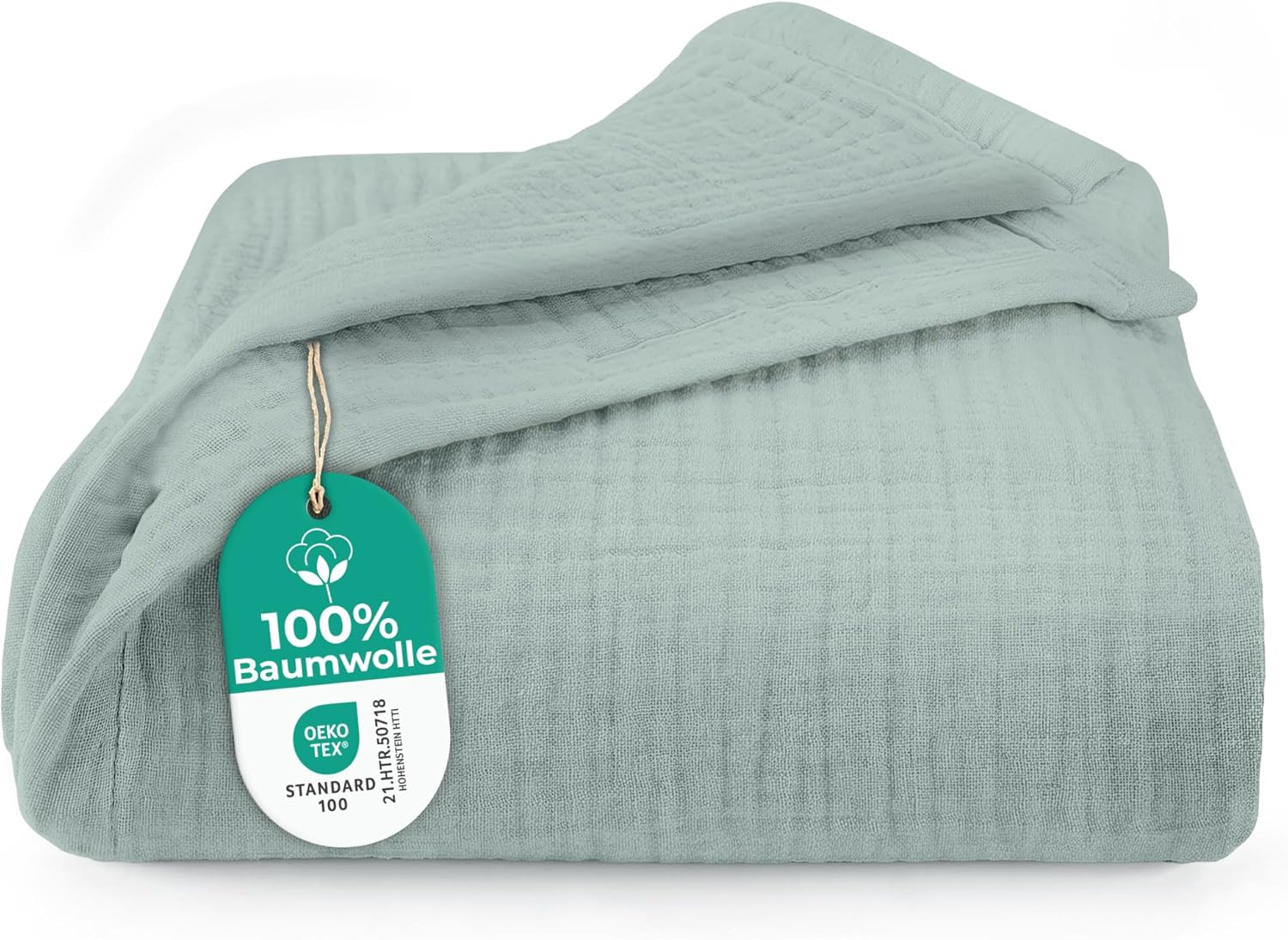 Dreamzie Musselin Tagesdecke 180x220 cm – leichte Baumwollgaze in Hellgrün (Oeko-Tex zertifiziert)