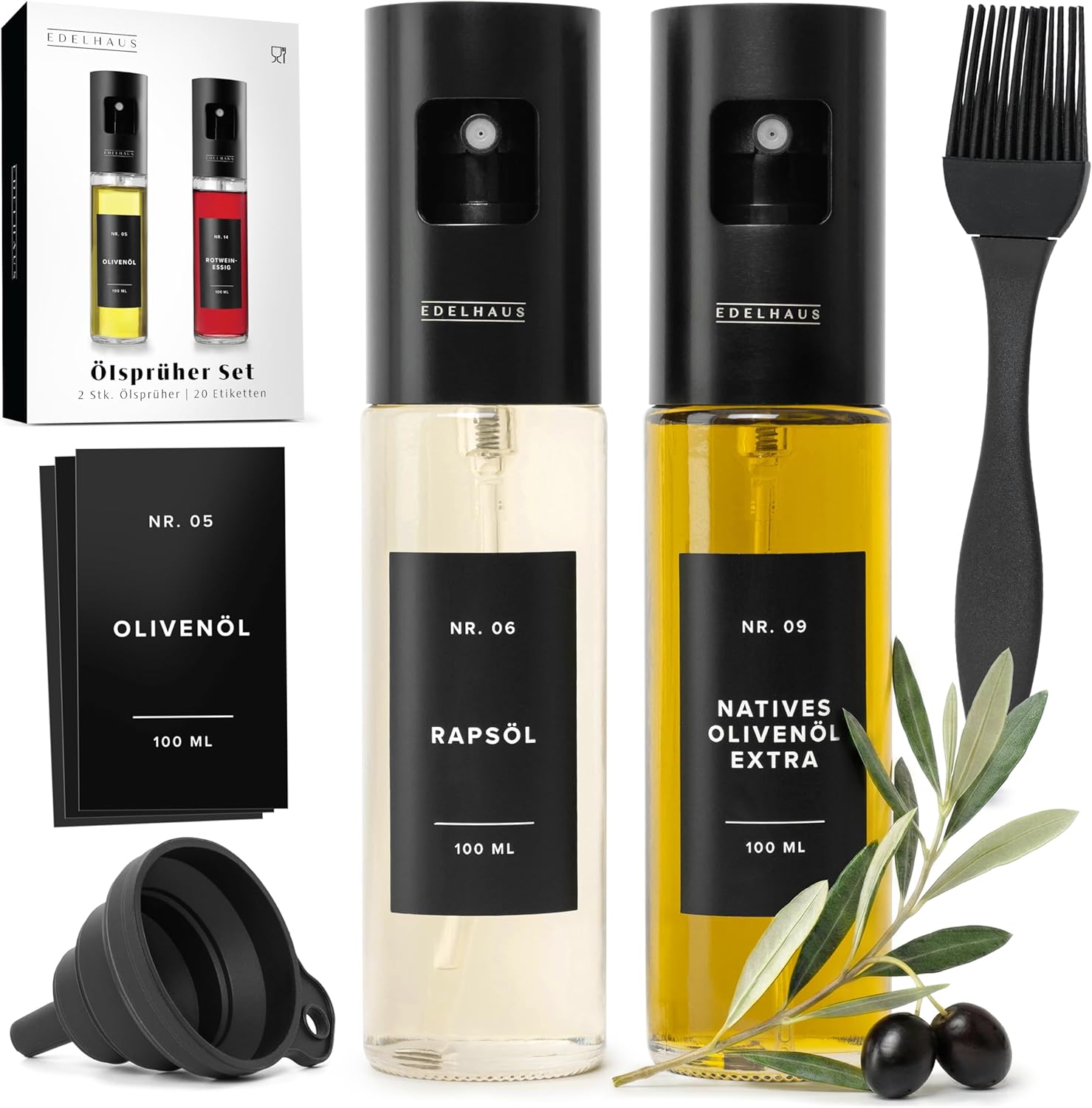 EDELHAUS Ölsprüher 2er Set aus Edelstahl & Glas – feiner Ölzerstäuber mit Etiketten, Trichter & Silikonpinsel