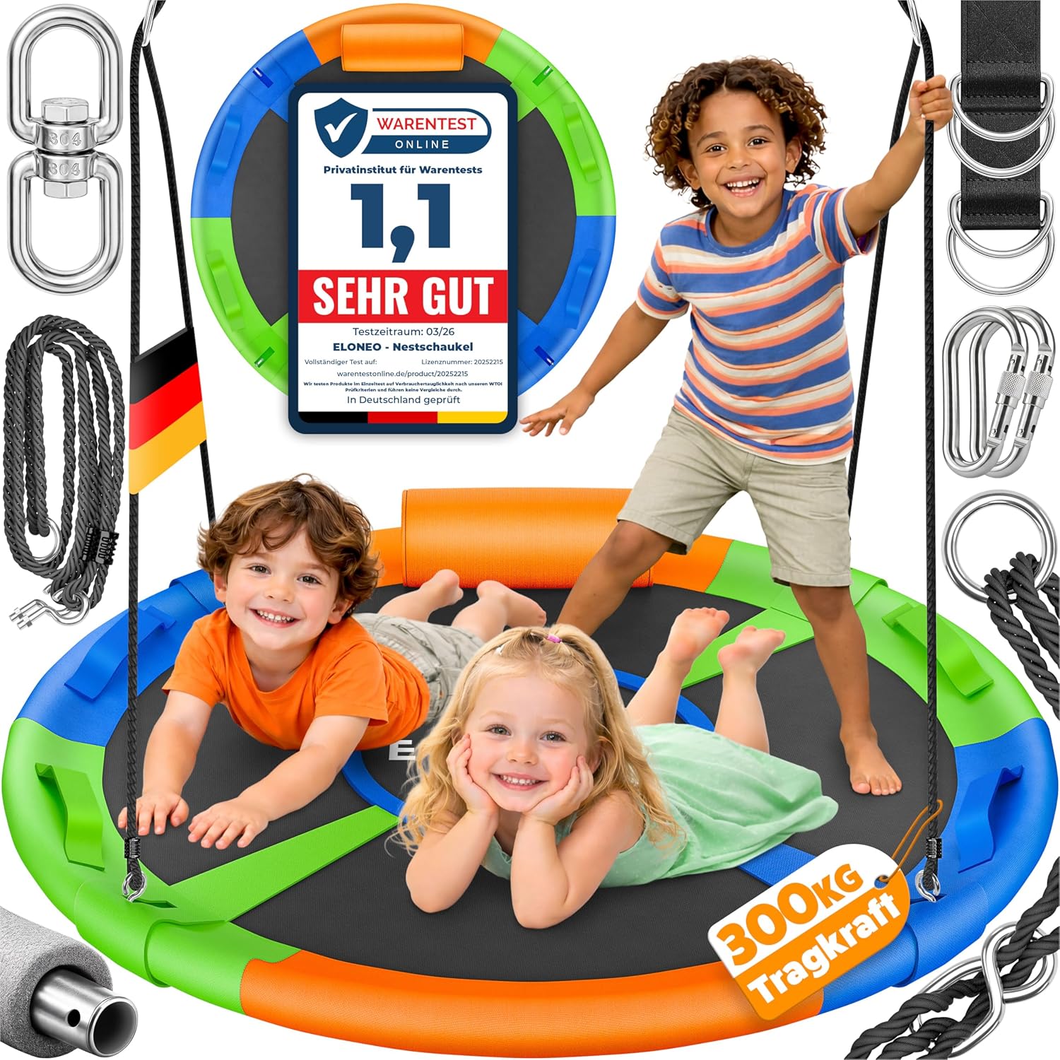 Für Käufer, die eine robuste Nestschaukel für Indoor- und Outdoor-Einsatz suchen und dabei auf höhenverstellbare Aufhängung sowie Komfort durch Kissen und Schaumstoffrahmen Wert legen, ist die ELONEO Nestschaukel mit 120 cm Durchmesser eine nachvollziehbare Wahl. Die angegebene Belastbarkeit bis 300 kg und die reißfesten PE-Seile sprechen dafür, dass sie eher auf intensivere Nutzung ausgelegt ist.