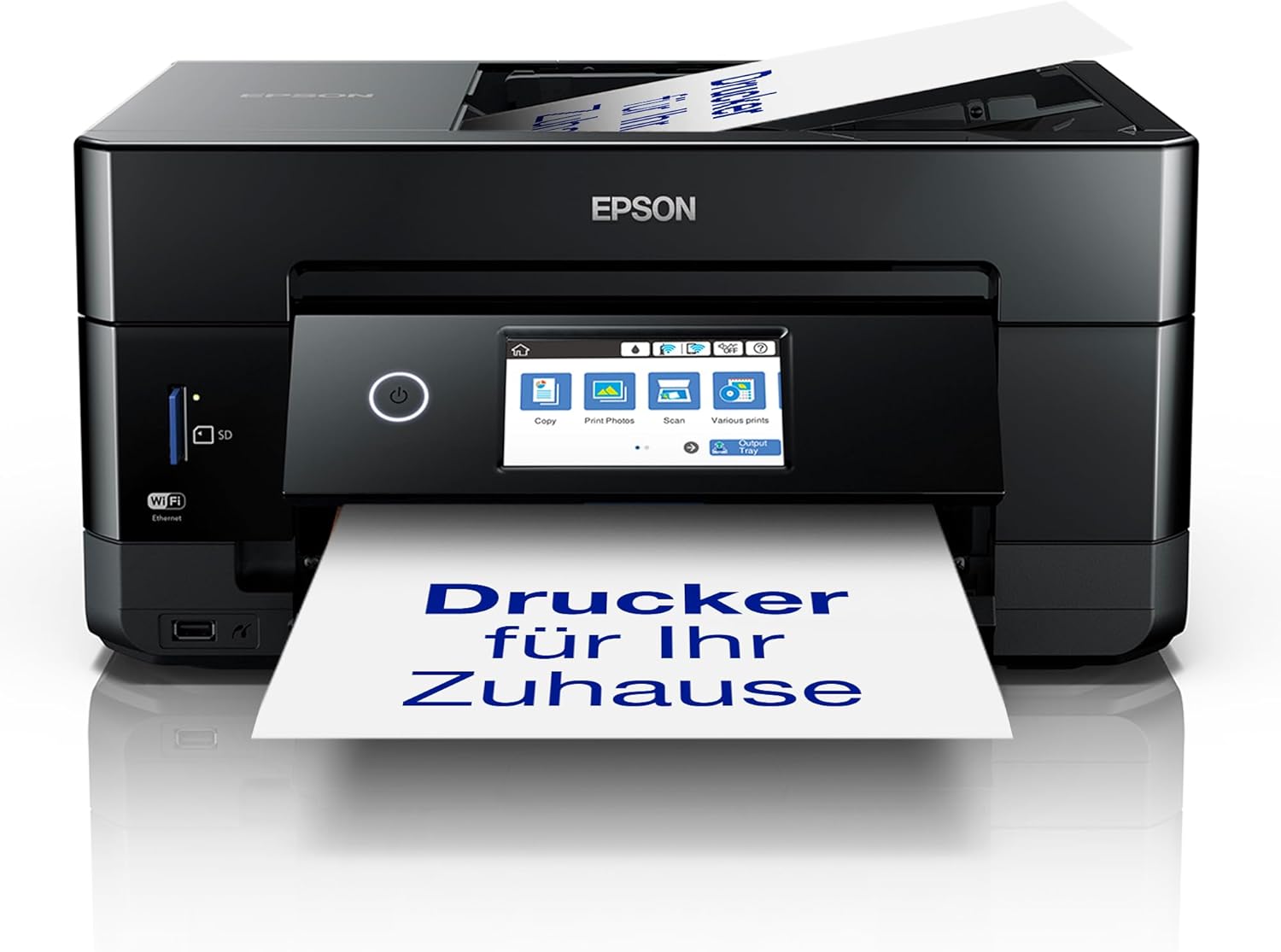 Der XP-7100 kombiniert mehrere Funktionen in einem Gerät: Drucken, Scannen und Kopieren. Für den Papierdurchsatz ist ein automatischer Dokumenteneinzug (ADF) für das Scannen und Kopieren von mehrseitigen Vorlagen vorgesehen – sowohl einseitig als auch doppelseitig. Dazu gibt es zwei Papierfächer für DIN A4-Dokumente sowie einen Einzug auf der Rückseite für Sondermedien, etwa wenn du stärkeres Material bedrucken willst.