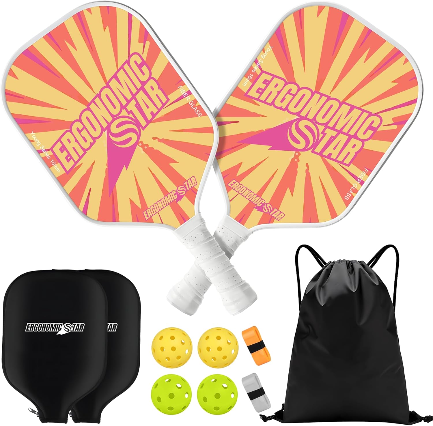 Ergonomicstar Pickleball-Set (Fiberglas-Schläger) mit 4 Bällen & Tragetasche – leicht für drinnen und draußen