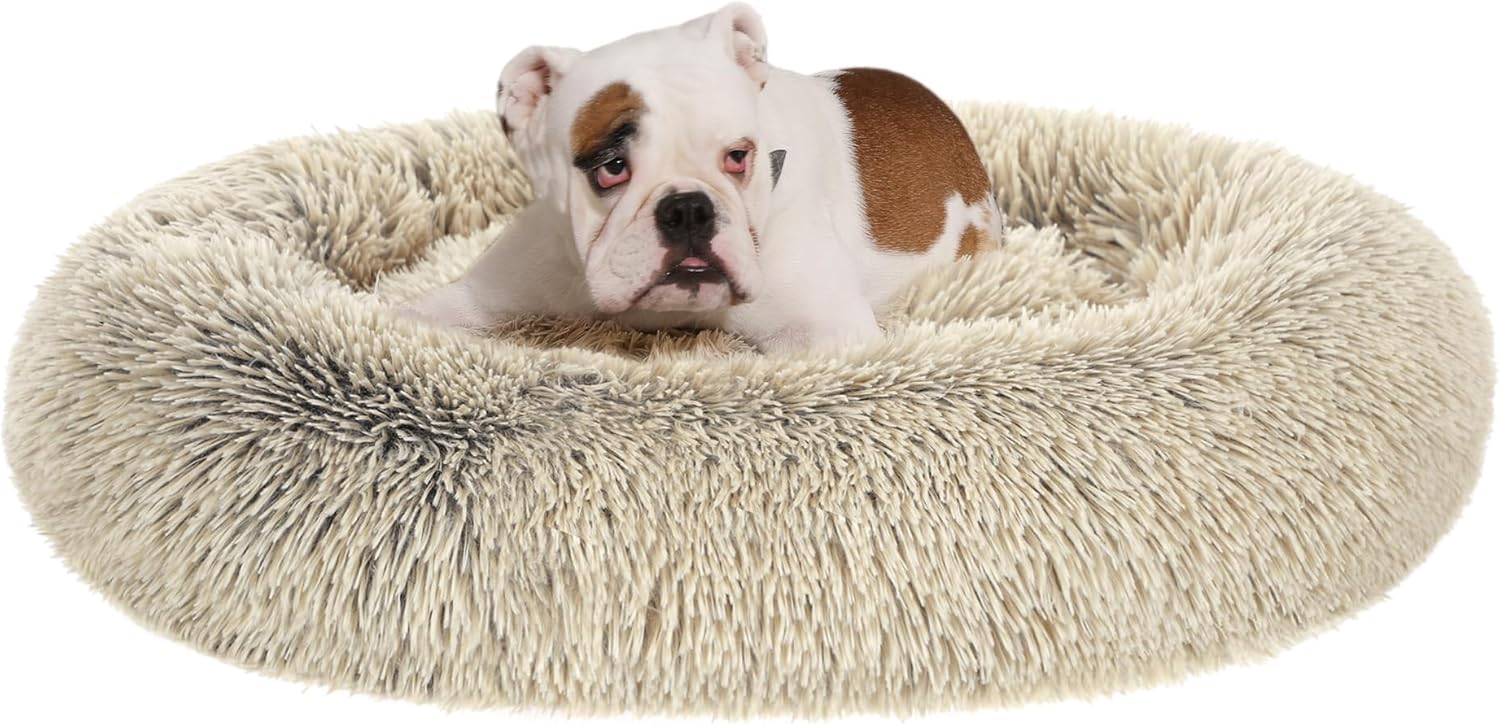 - Name: Feandrea Hundebett flauschig, Katzenbett, Donut Kissen, waschbar, Polsterung in der Mitte herausnehmbar, Langer Plüsch, 90 cm Durchmesser, Ombré-Khaki PGW041S01
