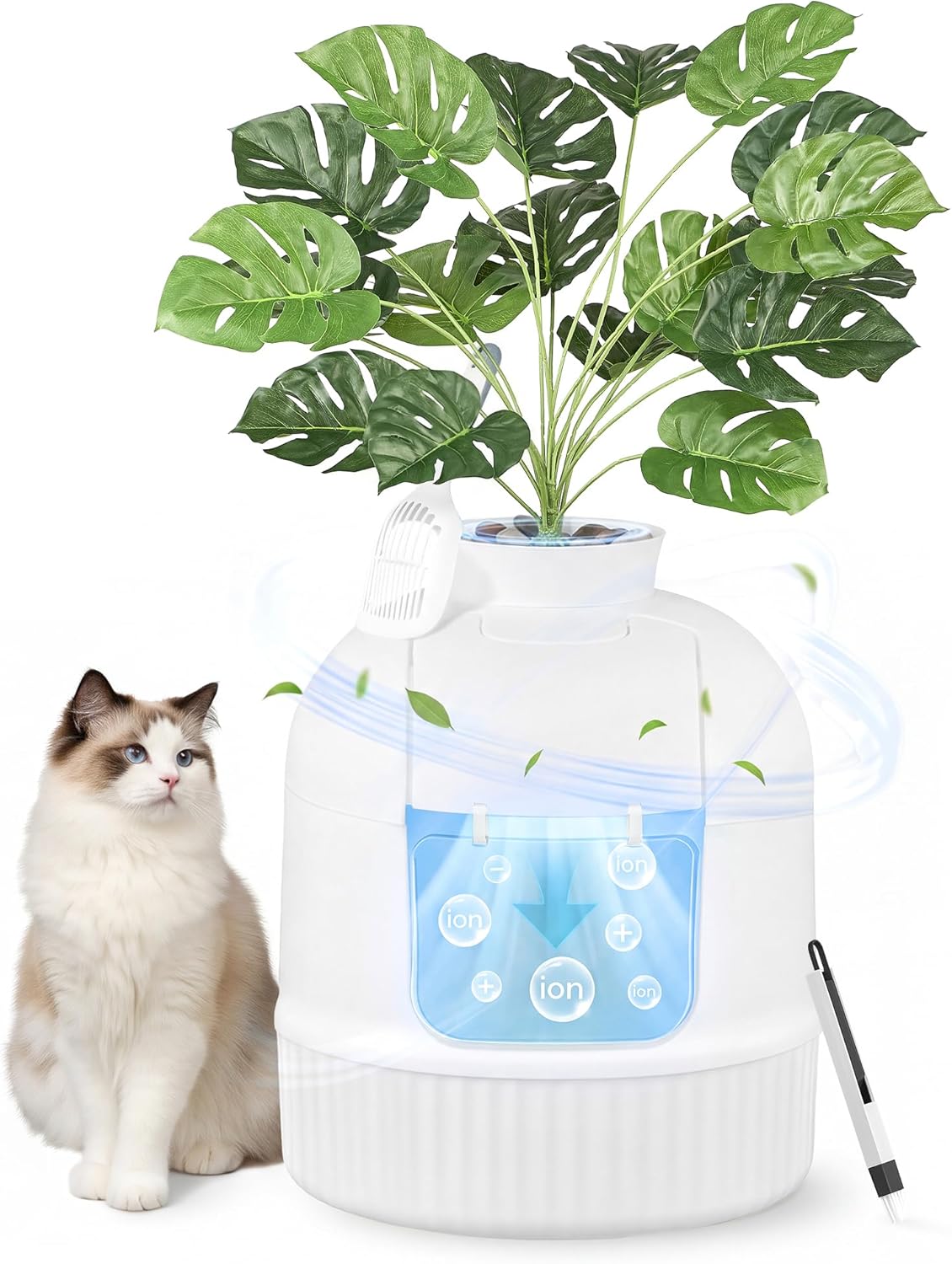 Diese Feandrea Katzenklo-Variante ist bewusst als Wohnraum-Deko gestaltet: Sie sieht „auf den ersten Blick“ wie ein Blumentopf aus und nicht wie eine Katzentoilette. Eine künstliche Pflanze, dekorative Kieselsteine sowie eine strukturierte Außenfläche sollen dafür sorgen, dass das Katzenklo im Haushalt optisch weniger auffällt. Dazu kommt ein geschlossenes Design, das Gerüche im Inneren halten soll.