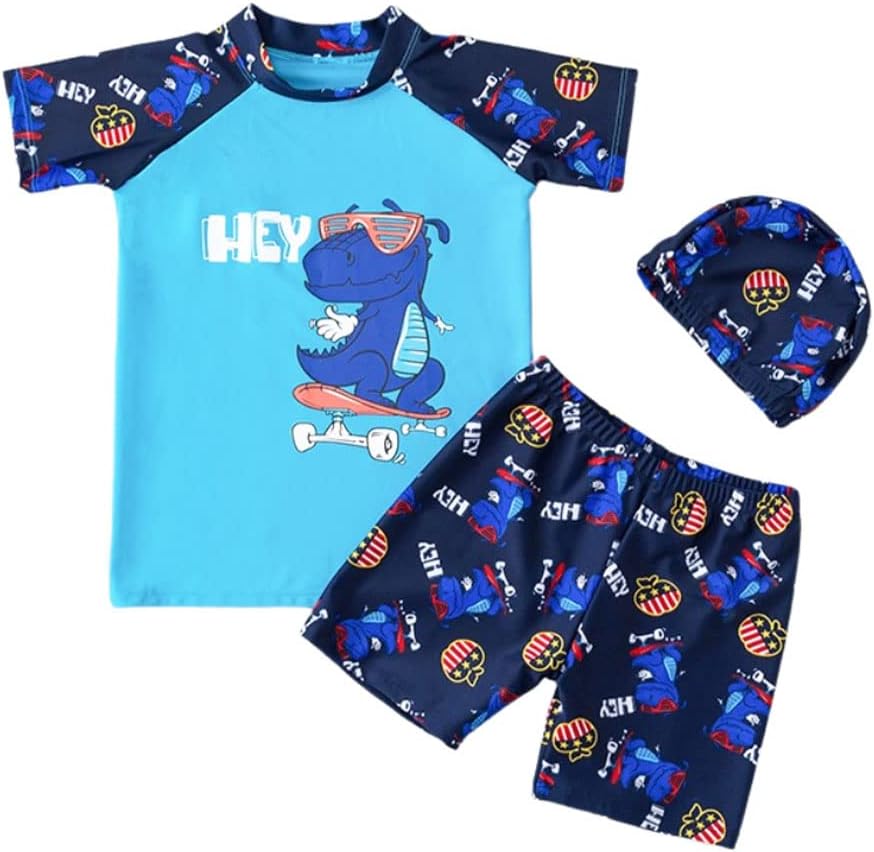 Das FedMois 3-teiliges Badeanzug-Set für Kleinkinder besteht aus einem Badeshirt, einer Badeshorts und einer Bademütze. Es richtet sich an Jungen und deckt den Bedarf an sicherem, bequemem Badespaß ab. Durch den elastischen Bund mit Kordel und das weiche, schnelle Trockenmaterial eignet es sich gut für regelmäßige Strand- oder Poolbesuche sowie für Sommerurlaub.