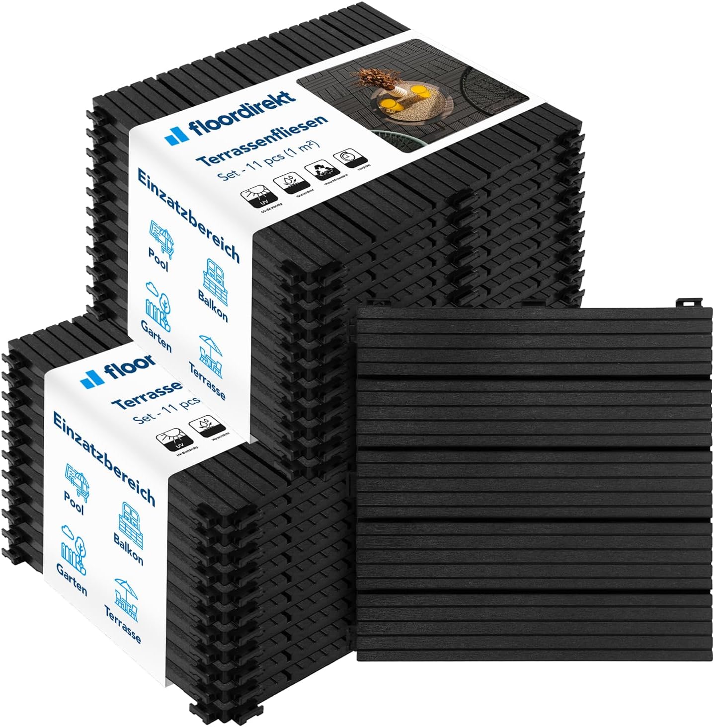 Floordirekt Fliesen für Balkon und Terrasse sind ein Bodenbelag auf Basis eines Klicksystems. Du bekommst Fliesen im Format 30x30 cm, die sich laut Hersteller schnell miteinander verbinden lassen – ohne dass du dafür handwerkliche Fachkenntnisse brauchst. Das Set ist als Flächenpaket gedacht: Für 2 m² sind insgesamt 22 Terrassenfliesen vorgesehen.