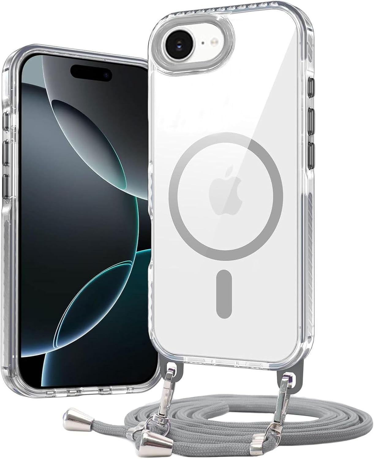 Galful Handykette Handyhülle für iPhone 17e: magnetische MagSafe-Schutzhülle mit abnehmbarer Eckschutz-Kette (transparent, grau)