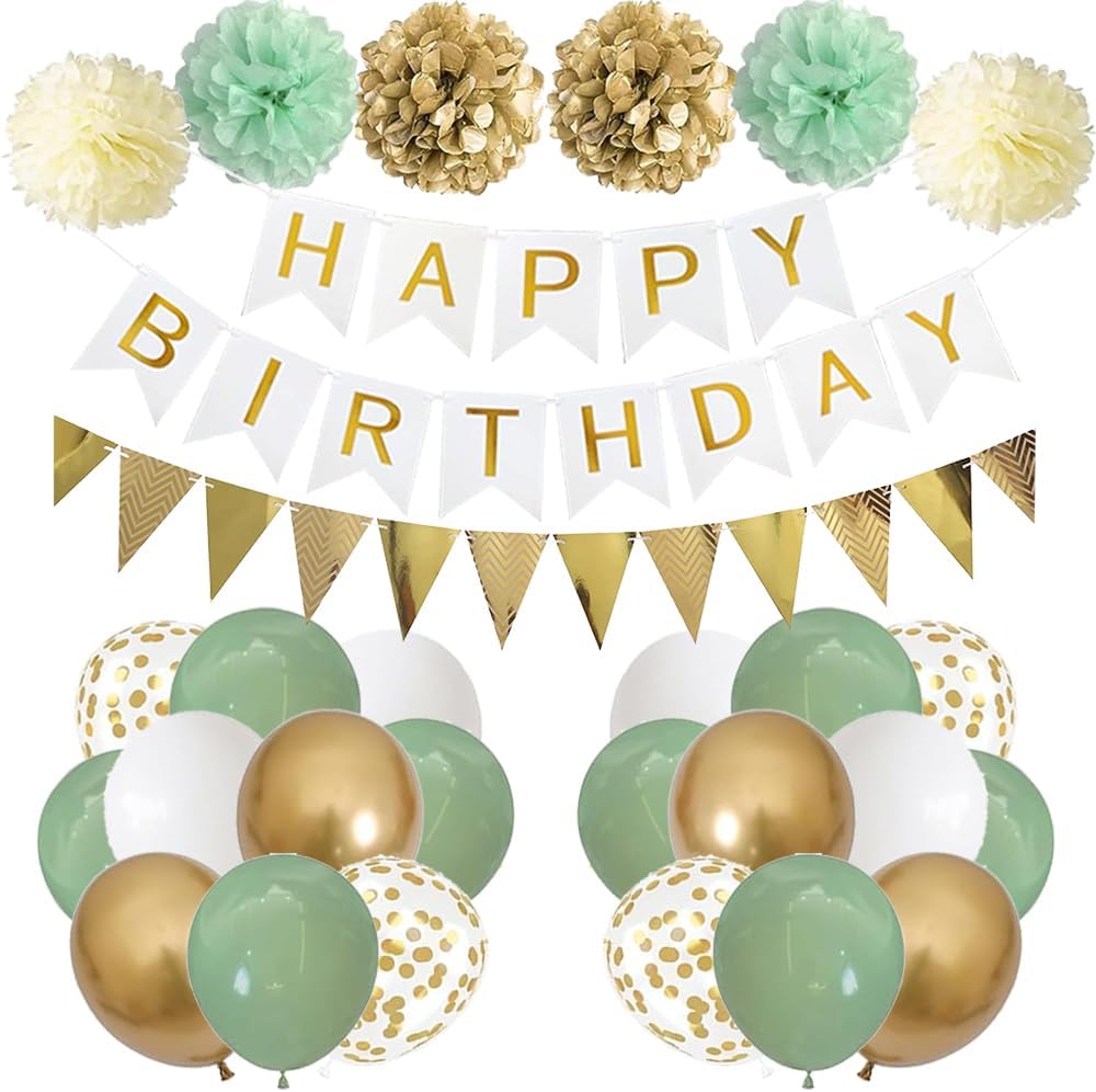 Dieses Dekorationsset setzt auf eine elegante Weiß-Grün-Gold-Kombination und bietet alles, was für eine stimmige Geburtstagsszene nötig ist: ein WHITE HAPPY BIRTHDAY Banner, eine goldene Wimpelgirlande, Papierpompons in Grüntönen und creme/gold, sowie Latexballons in passenden Farben. Es richtet sich an Feierlustige, die eine schnelle, optisch ansprechende Dekoration suchen, die sich flexibel drinnen oder draußen nutzen lässt.