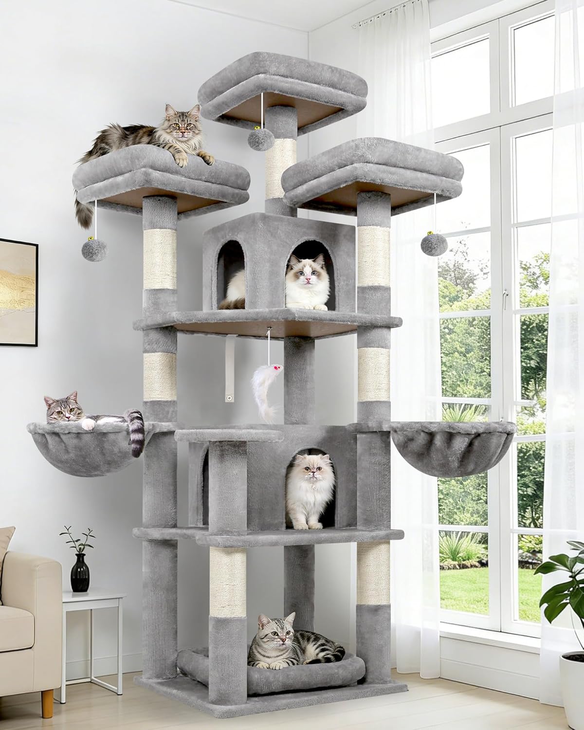 - Taoqimiao 180 cm Kratzbaum groß MS026LG in Dunkelgrau mit 2 Katzenhäusern, Kratzflächen und Hängematte