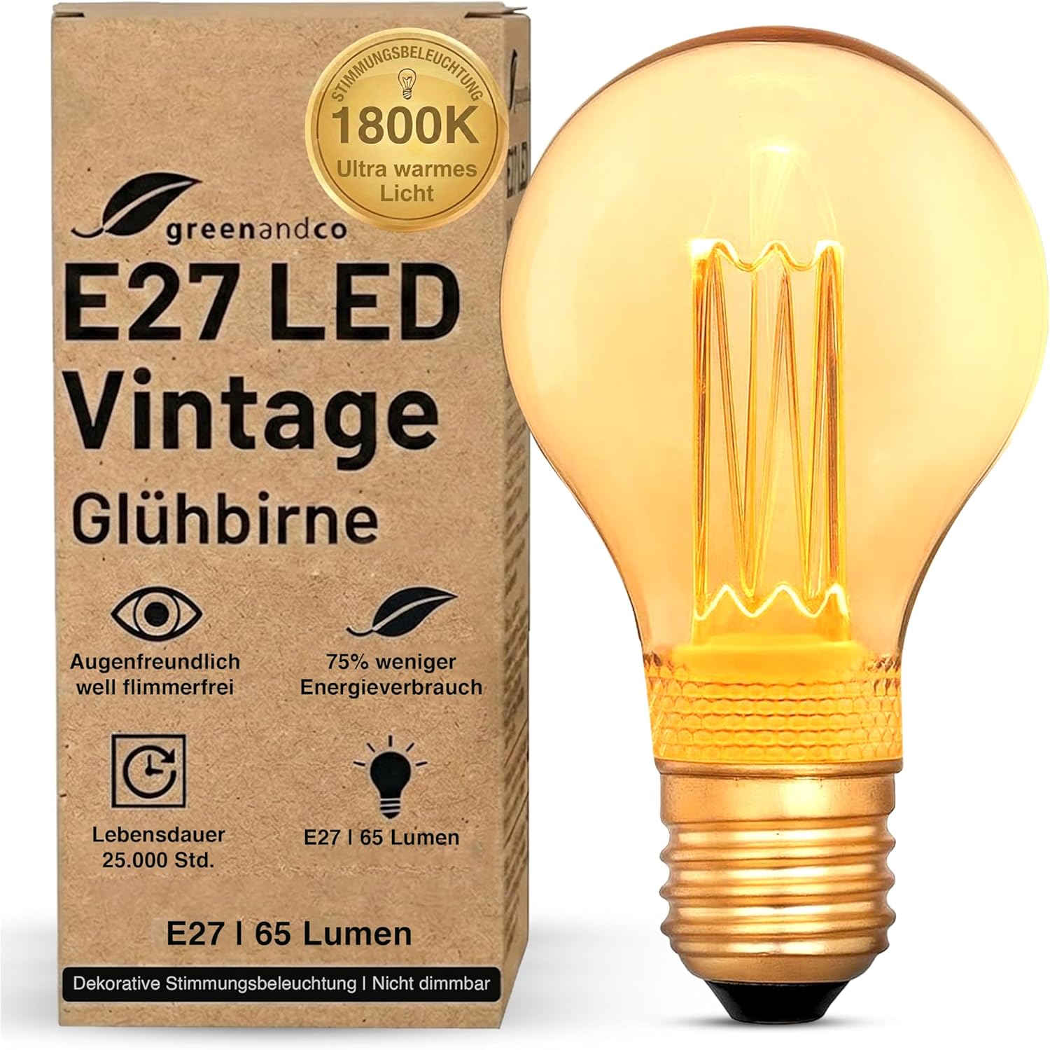 Wenn du auf stimmungsvolles, extra warmweißes Licht setzt und die Lampe sichtbar im Raum sitzt, ist die greenandco E27 LED Vintage Glühbirne eine nachvollziehbare Wahl. Sie kombiniert die Retro-Optik (Glühfaden-Effekt) mit flimmerfreiem Betrieb und ist dabei als dekorative Stimmungslampe gedacht.