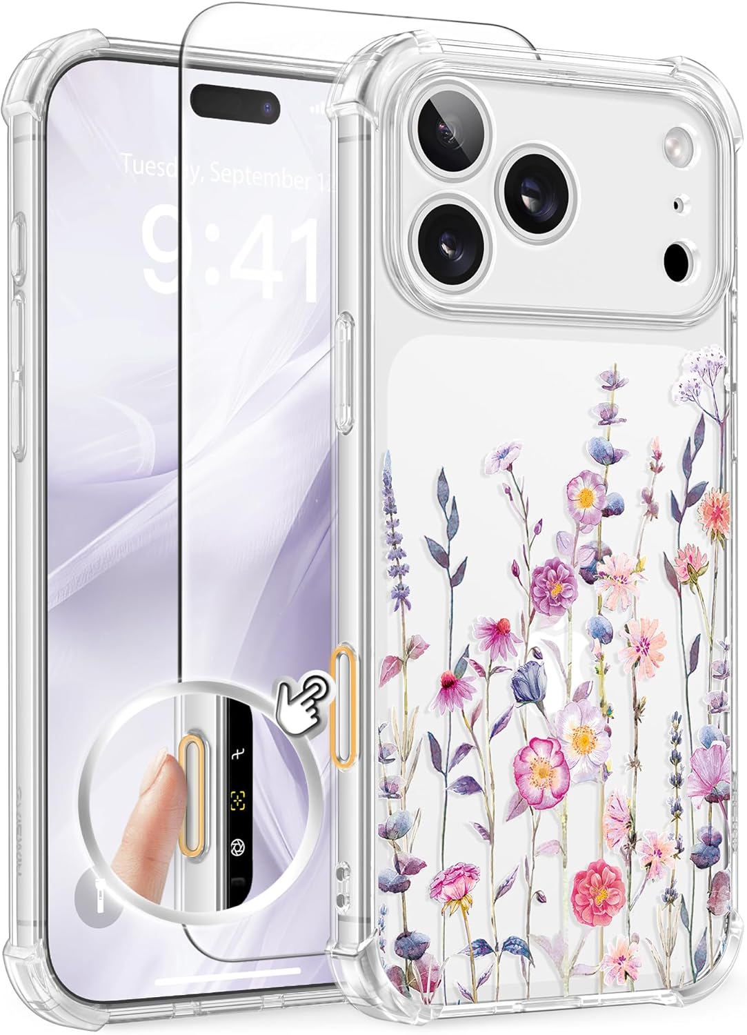 GVIEWIN Hülle für iPhone 17 Pro Max (6,9") mit Displayfolie, 360° Militärschutz und Blumen-Design