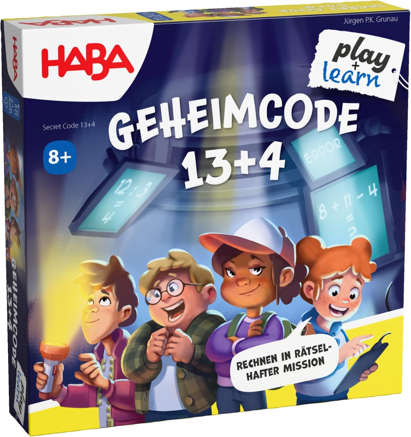 HABA Geheimcode 13+4 ist ein Lern- Brettspiel, das Kopfrechnen spielerisch trainieren soll. Im Fokus stehen Rechenarten wie Addition, Subtraktion, Multiplikation und Division – und das Ganze ist in eine kleine „Rettungsmission“ mit einem geheimnisvollen Spielplan verpackt. Die Idee dahinter: Matheaufgaben lösen, um den Lieblingscomic zu retten, während man gleichzeitig durch Fallen und Rechenrätsel geführt wird.