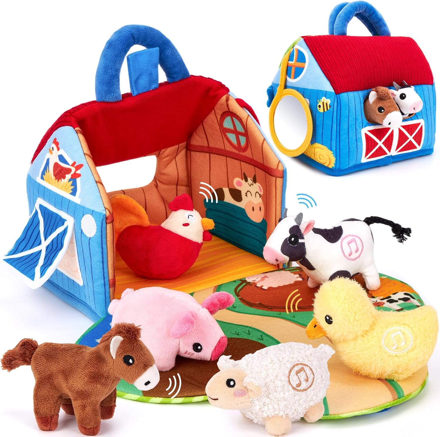 - Lieferumfang: 6 Plüschtiere, 2-in-1 Scheune und Spielmatte, tragbarer Griff