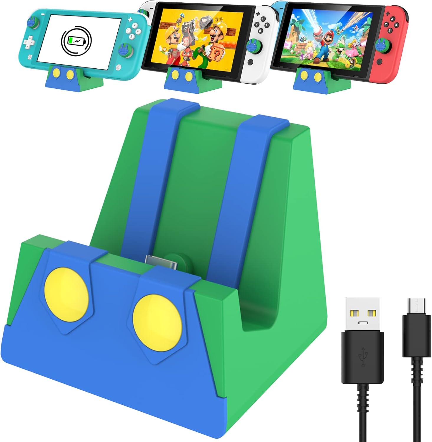 Das Design ist dabei bewusst verspielt: Statt einer nüchternen Ladestation kommen klassische Figuren aus Switch‑Spielen als Motiv zum Einsatz. Auf dem Papier wirkt das wie eine Kombination aus funktionalem Zubehör und kleiner Spiel‑Stil‑Dekoration. Ob das für dich wichtig ist, hängt natürlich vom Geschmack ab.